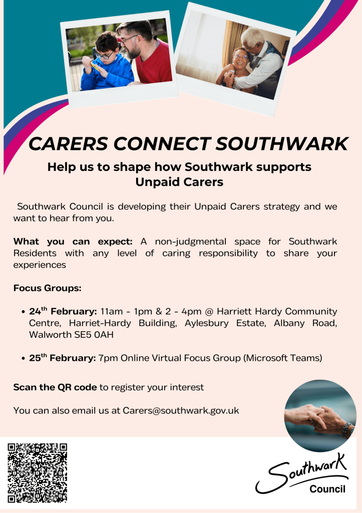 Southwark Council is developing its Unpaid Carers Strategy, and they are inviting unpaid carers to take part in upcoming focus groups to share real experiences, which are your lived reality.