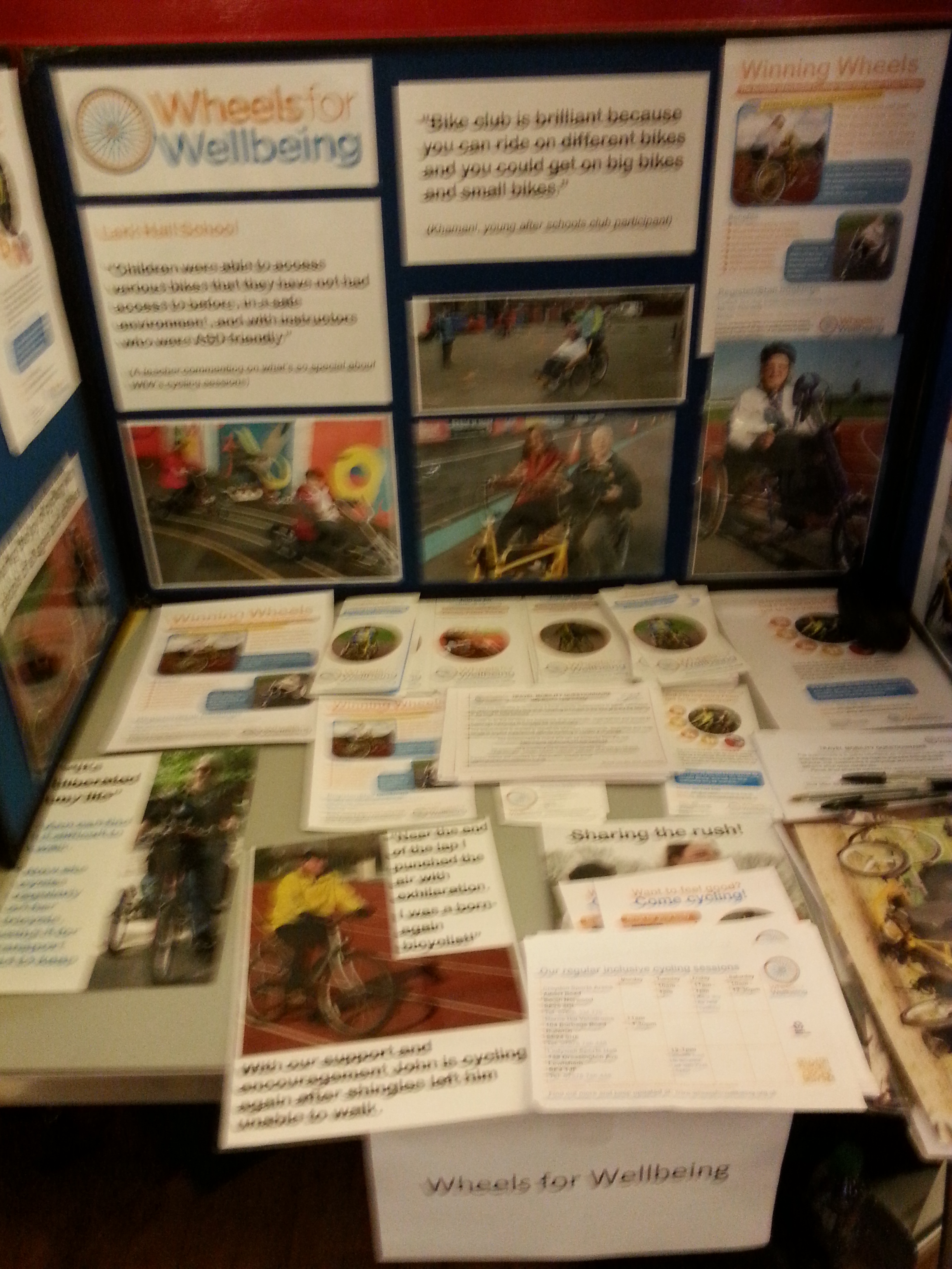 I used to ride a bike, seriously I did!! Unfortunately I have let my bike rust in the game, but thats no excuse anymore since we have an organisation called wheel’s for wellbeing. Here they allow people a chance to ride bikes to improve health and fitness. This also applies to those who have disabilities. I checked out some of the information at their stall.