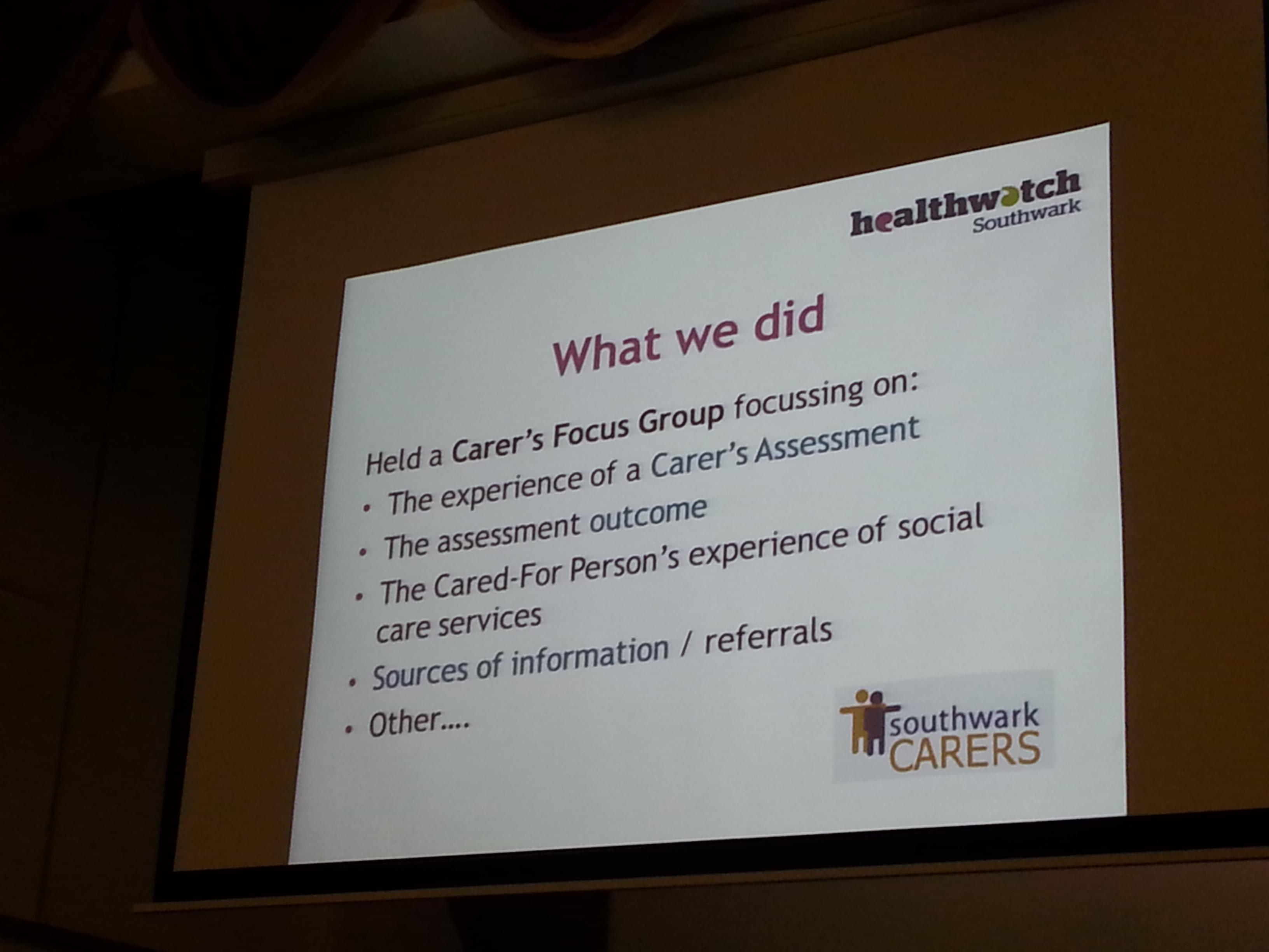 Next we head from sec-Chan the Healthwatch Southwark’s Development Officer. She gave updates about the Carer’s Focus Group done with Southwark Carers. Here she spoke on the following.