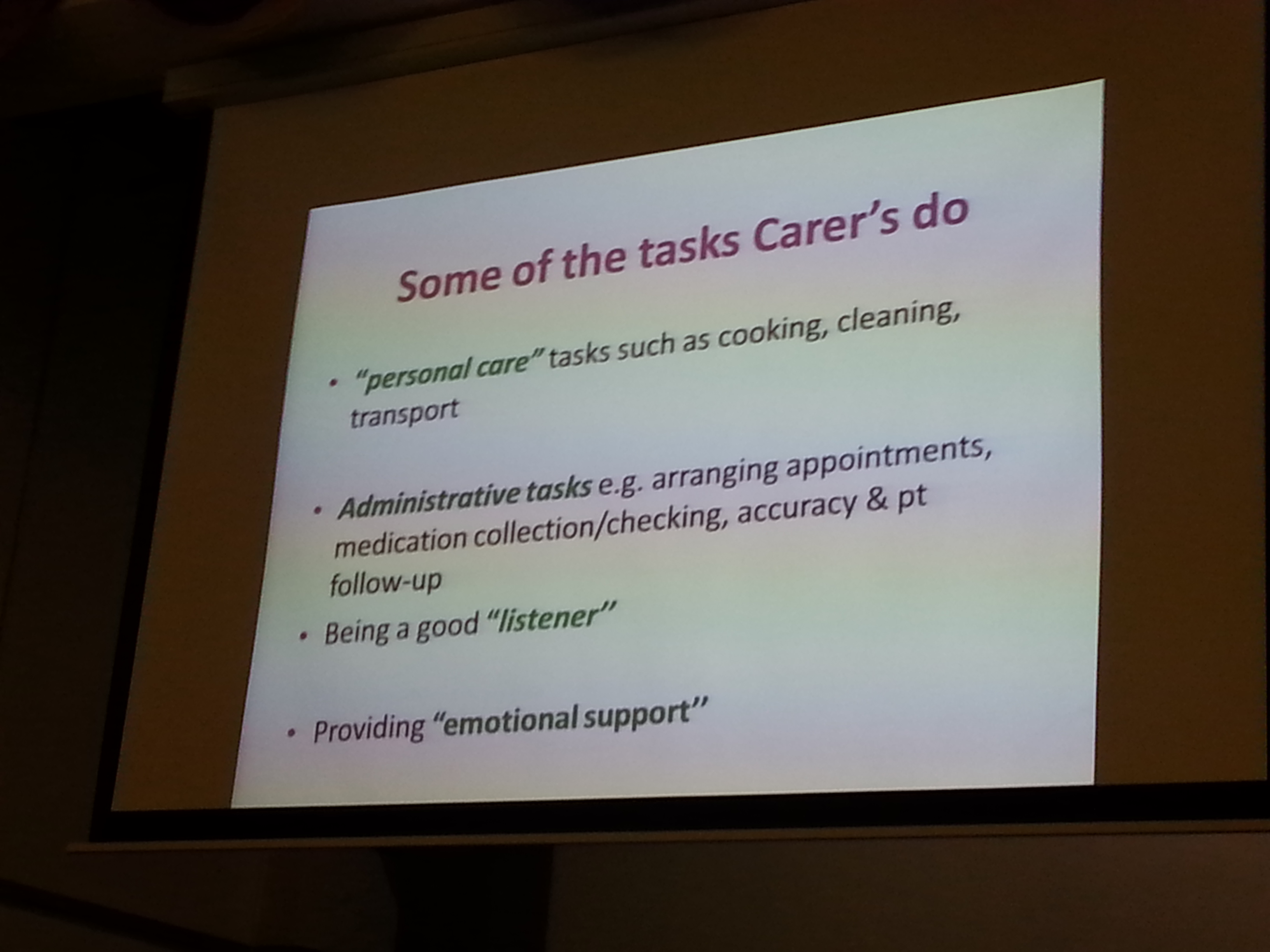 We cannot always assume everyone knows what a carer is. So the presentation on carer’s views finished up on the roles of a carer which were