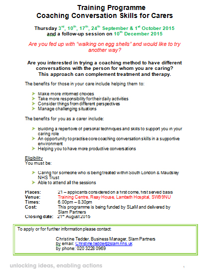 There are of course many courses that allow for mental health carers to enhance their skills, but this blog post focuses on a particular course provided by SLaM partners for mental health carers of the London Borough of Lambeth.