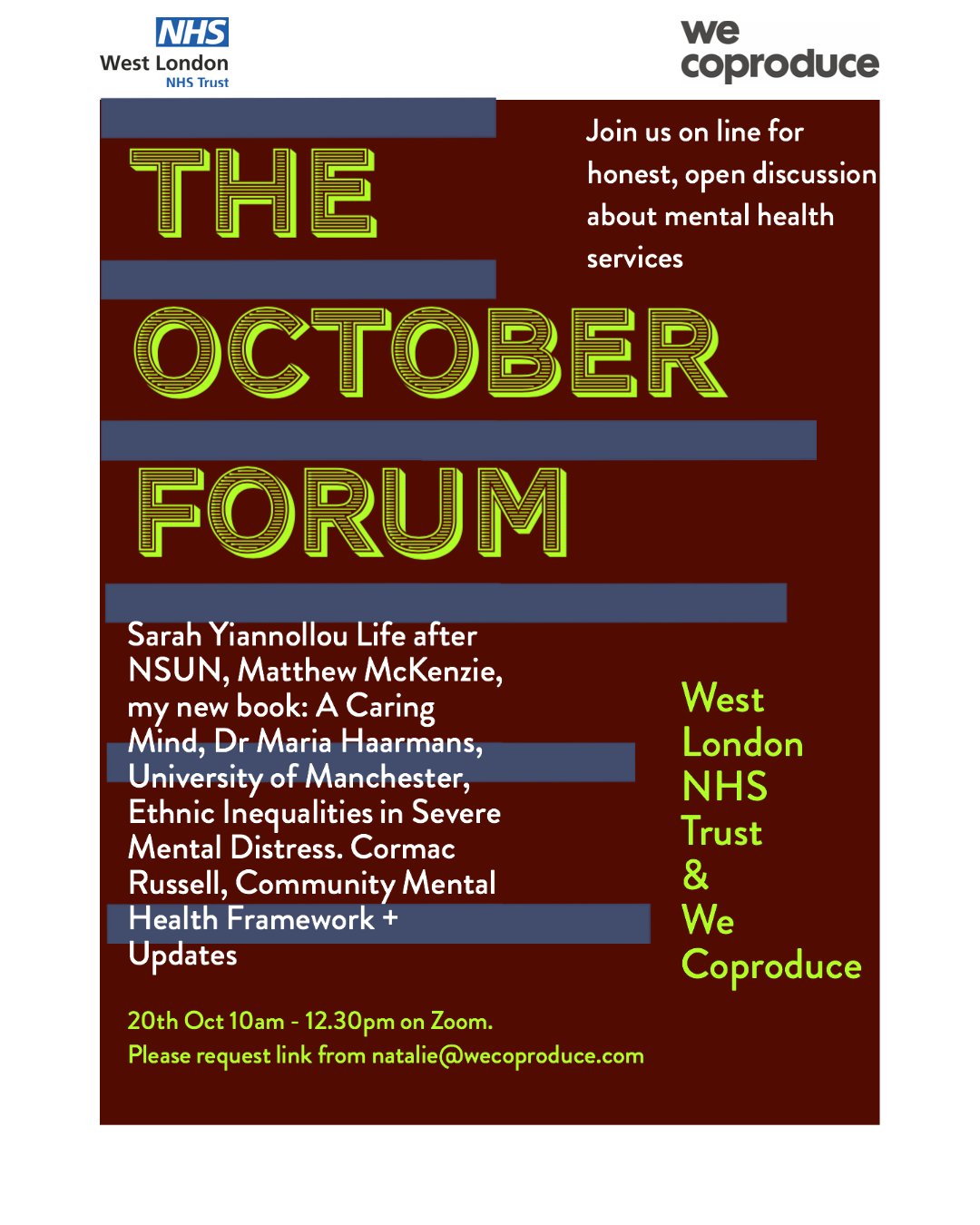 We Coproduce do a lot more than run their forums over in Hammersmith & Fulham, Hounslow and Ealing. Over many years they have worked closely with the mental health trust West London NHS trust on improving mental health for the community. For the October forum facilitated by both Jane McGrath and Natalie Louise there were many exciting speakers.