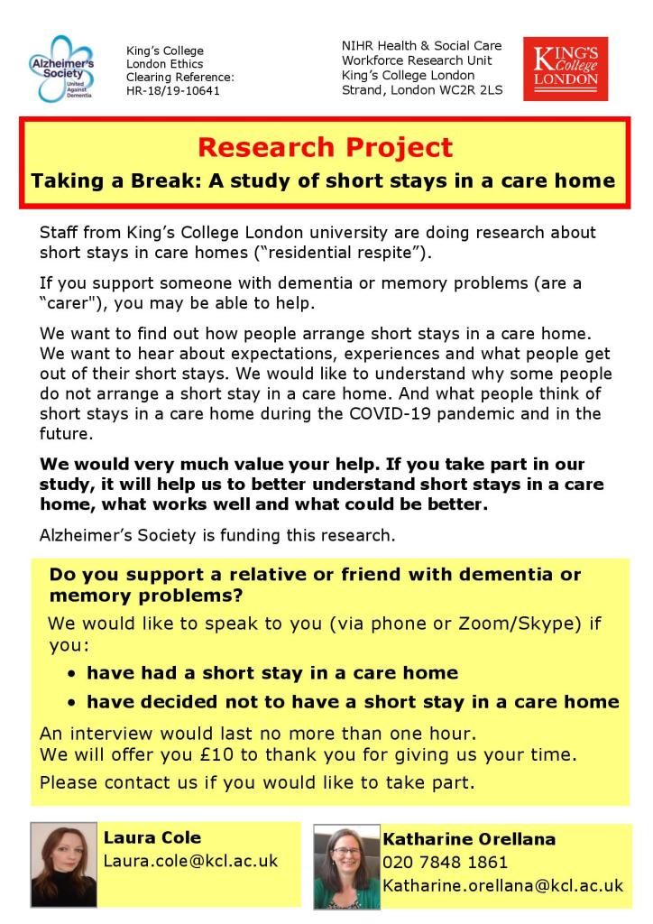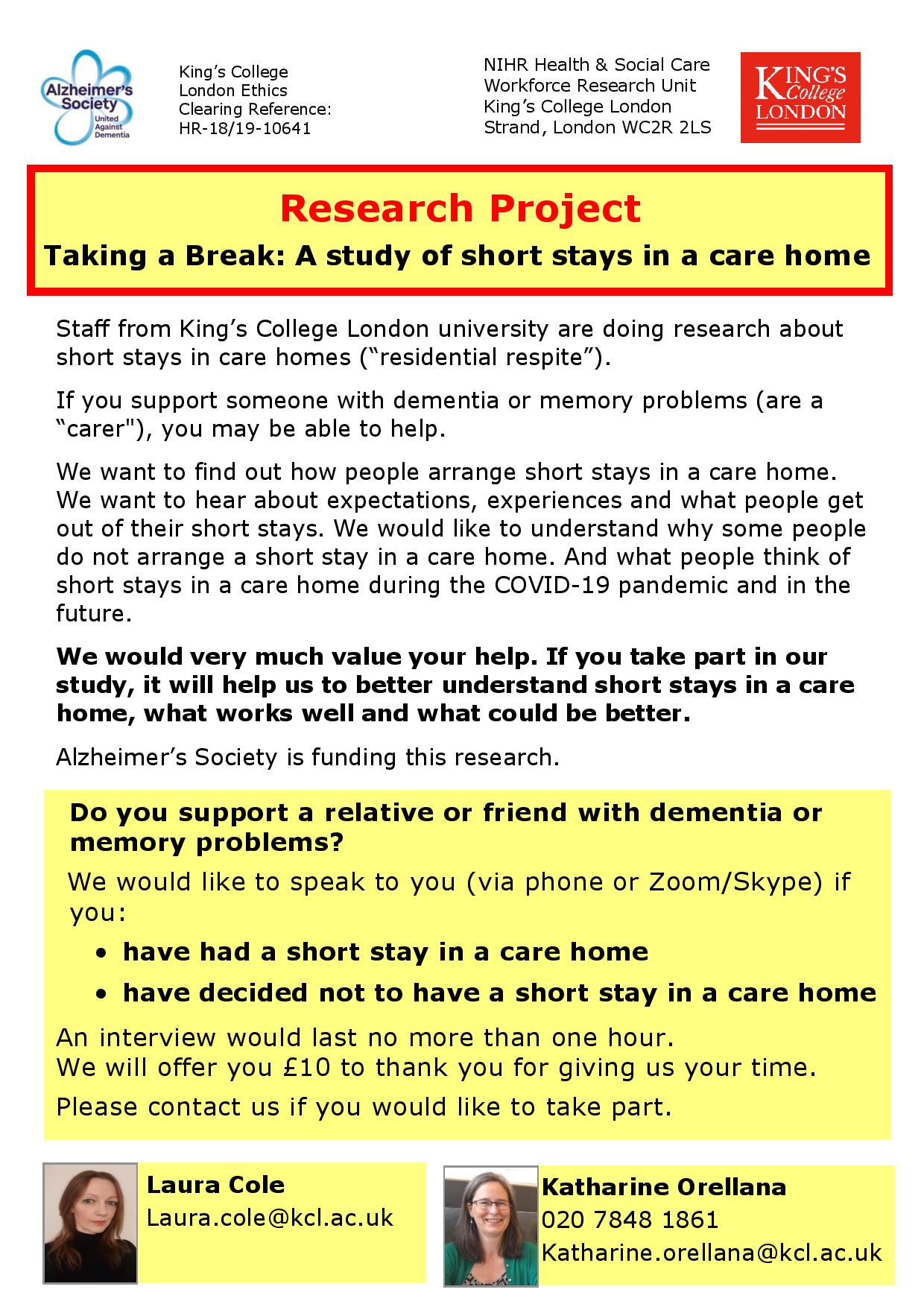 Research Project: A study of short stays in a care home Staff from King’s College London university are doing research aboutshort stays in care homes (“residential respite”). If you support someone with dementia or memory problems (are a“carer”), you may be able to help. Share this: Click to share on X (Opens in new window) X Click to share on Facebook (Opens in new window) Facebook Like Loading... Related