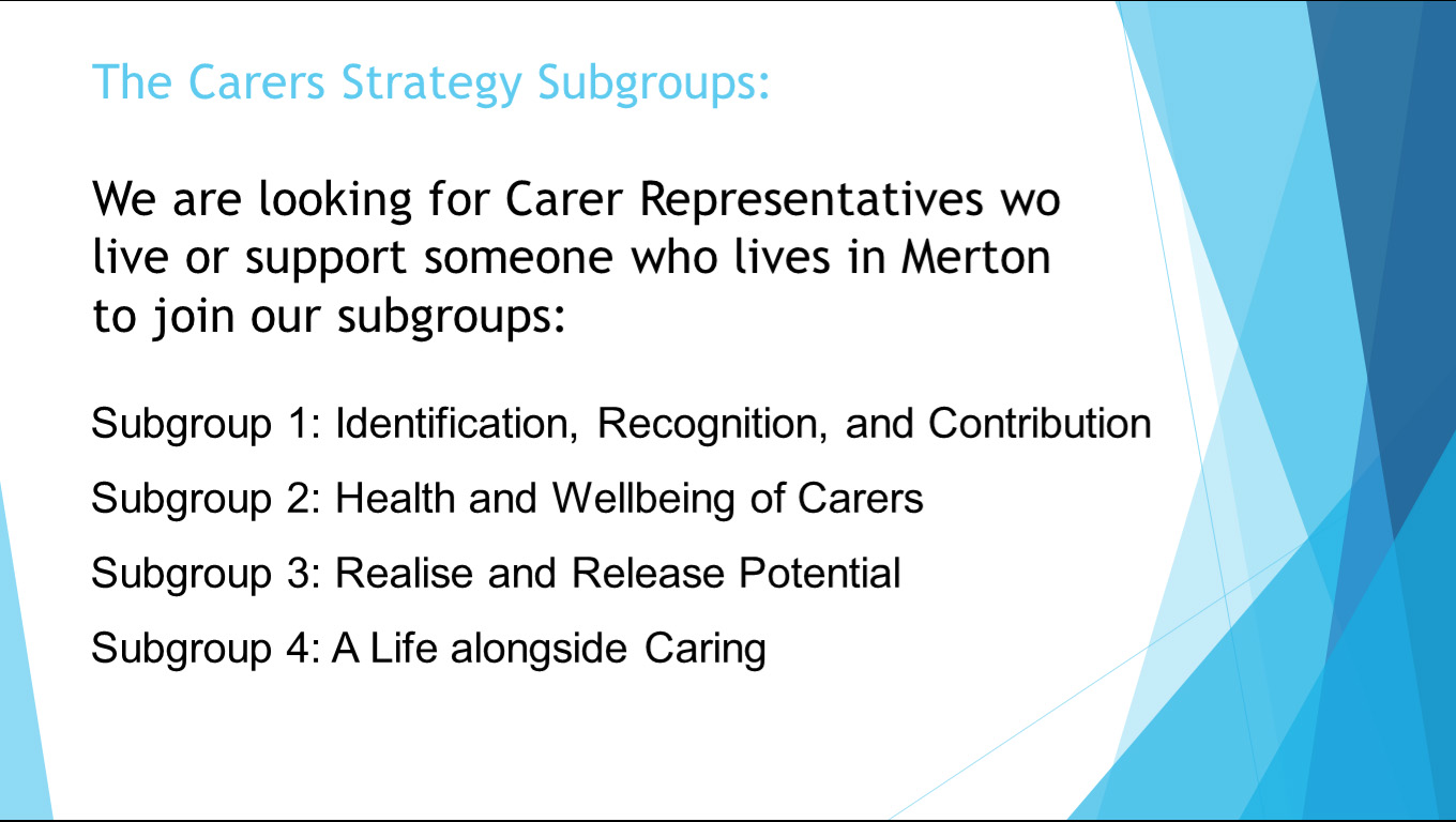 Heather mentioned that every London Borough should have have a health & Wellbeing board. So Merton met together as an implementation board in January 2021. with representatives from the trust from the CCG from the council. But wider than that DWP and carers support Merton and other local organizations like the alzheimer’s society Merton, Merton Mencap, etc. But most importantly, carer representatives as well.
