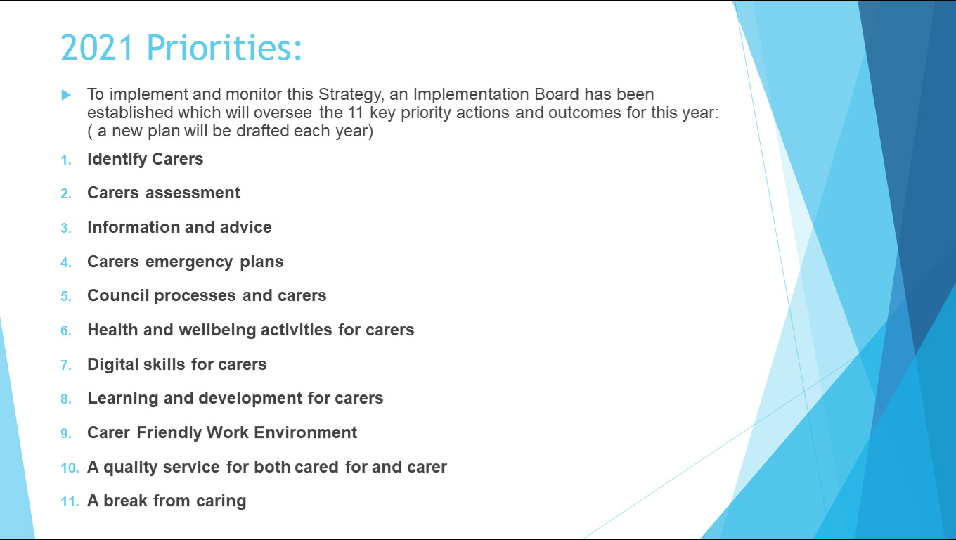 Heather continuted to present by mentioning that its not enough to Identify carers but actually talking to carers, this has been a real struggle actually for some of the universal services for GP practices to identify carers. At the moment because informal carers have been identified in Priority six with the vaccine rollout, this was flagged as a big issue that it is about identifying carers.