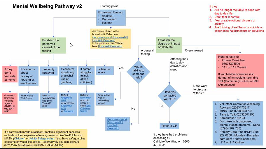 As a Greenwich Mental Health forum they broke the questions down. It was felt that if the group asked the right questions, then they could get understand what negative feelings have been experienced in the community regarding mental health and wellbeing. The aim was to find out what impact it’s having on targets to the level of services and specific needs. Thus the Greenwich MH forum developed a pathway based on the principles of what they called psychological first aid.
