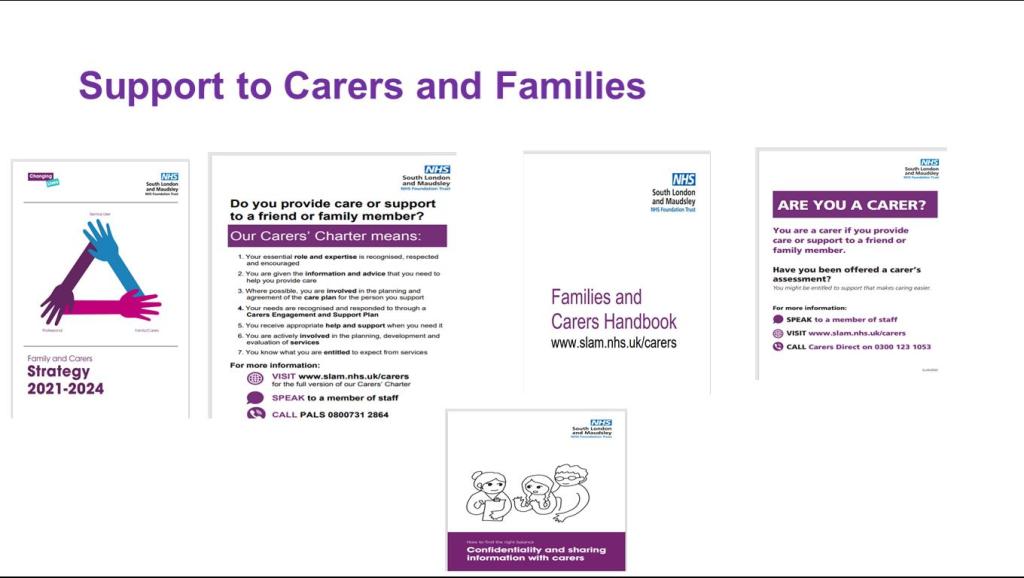 Carla spoke in terms of support to carers and families, where she thought, were important just to highlight again, on a slide where the work at that the trust is doing overall, in terms of manpower strategy, and that’s very much also founded on the triangle of care, where SL&M sees the carer very much as a partner in the care that SL&M provide. There’s a lot of information that SL&M has developed as a trust and under the leadership of Gabriel Richards, who leads strategically on the carer’s agenda. SL&M has got a carer’s charter that is highlighted. SL&M also provides information in their families and carers Handbook, and also information leaflets, posters shown in the blog regarding carers rights under the care rights, writing, carers assessment. SL&M also has information about confidentiality and sharing of information.