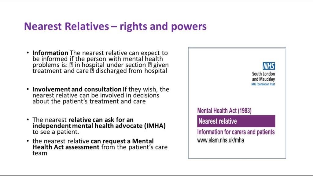 SL&M also provide information to nearest relative where we have useful nearest relative leaflets as well on what is provided to carers. One of SL&Ms duties is to try To ensure that ‘cared for’s relatives are informed and consulted with, particularly when there was a Mental Health Act assessment under Section two of the mental health act. The approved mental health professional has a duty to inform the nearest relative under Section three, where the relative has the power to object to someone being detained to a loved one being detained under the Mental Health Act. The nearest relative can also ask for an IMHA, which is an independent mental health advocate to see the patient and the nearest relative can request a mental health assessment, which she thinks sometimes nearest relatives not everyone is aware of that in certain circumstances where it’s been really difficult or challenging to access for whatever reason. So whilst the local authority is to consider the assessment under the Mental Health Act, or the rights and powers of a nearest relative. The nearest relative can write to the associate hospital managers to request for discharge. Sometimes that’s out here too, but in circumstances where they’re responsible clinician disagrees from a clinical point of view, they can roll that request up to the hospital managers who will review that decision as well.