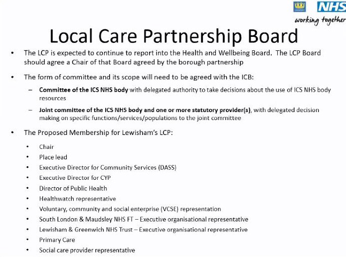 Elected representatives and elected leadership from each of the local authorities as well as the representative director from Adult Social Care, children, young people services, Healthwatch and voluntary and community sector organizations. Charles reassured us that in southeast London, there aren’t any private sector organizations involved in the partnership since there were a lot of questions from members about privatisation creeping in.