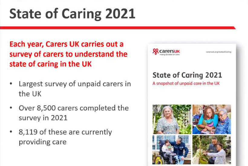 She recommended if we have time that we go and read up the report. Rachel then gave us a quick overview of the report. It’s actually the largest survey of unpaid carers in the UK. Carer’s UK conduct this every year, except for 2020 due to the pandemic. Carers UK did another research instead. But normally, they do this every year. So for the year 2021 it was completed by over 8500 carers, the vast majority of them are currently providing care. The kind of stats she showed in the presentation are for people who are currently caring.