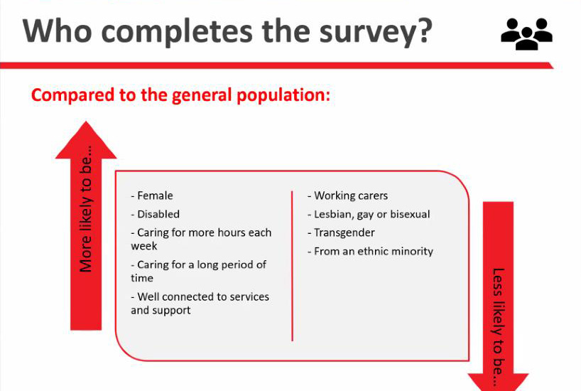 The people who complete the state of caring survey are more likely to be female, more likely to be women, more likely to be disabled. than the general population, and also likely to be at the heavy end of proving care than the average carer. Almost half of everyone that responded to this survey have over 90 hours a week.