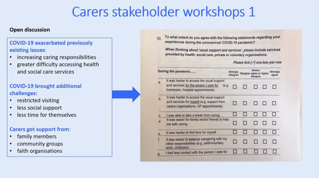 So in the open discussion, the attendees spoke about particular issues but they were facing particularly related to the pandemic because that was very pertinent at the time just come out of one of the lockdowns. Diane presented how their input fed into the content of the questionnaire. So this is what the researchers got from the first bit of discussion they had with people.