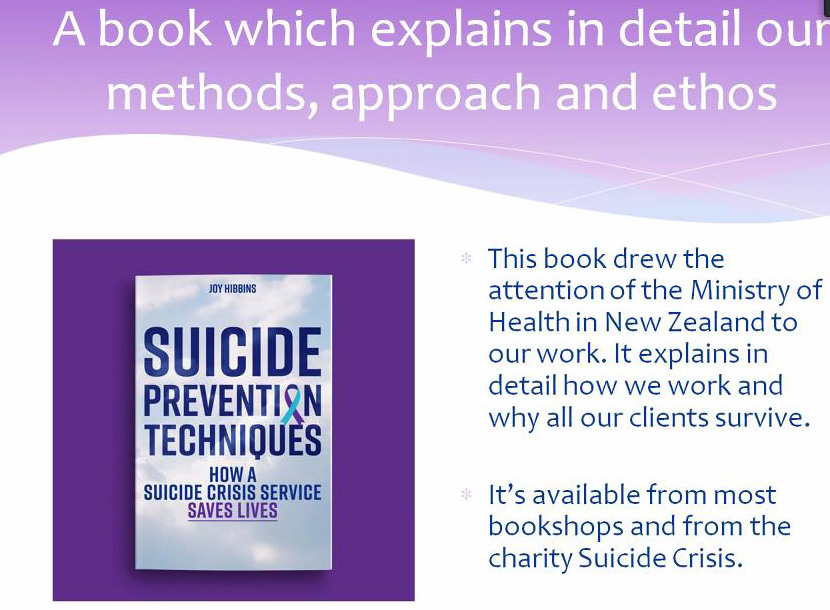 So with the suicide crisis center, people can either self refer or be referred. The referrals are from NHS, police charities, and all kinds of other agencies as well. From 2012 there was huge doubt and skepticism to where things are, plus it has been an extraordinary journey for the team in a very unexpected journey. where the work is having an impact in countries like New Zealand, where the Ministry of Health in New Zealand contacted Joy’s team, as they were devising their new national suicide prevention strategy to find out what they could learn and how they could use some of the learning that they took from Joy’s team in their strategy.