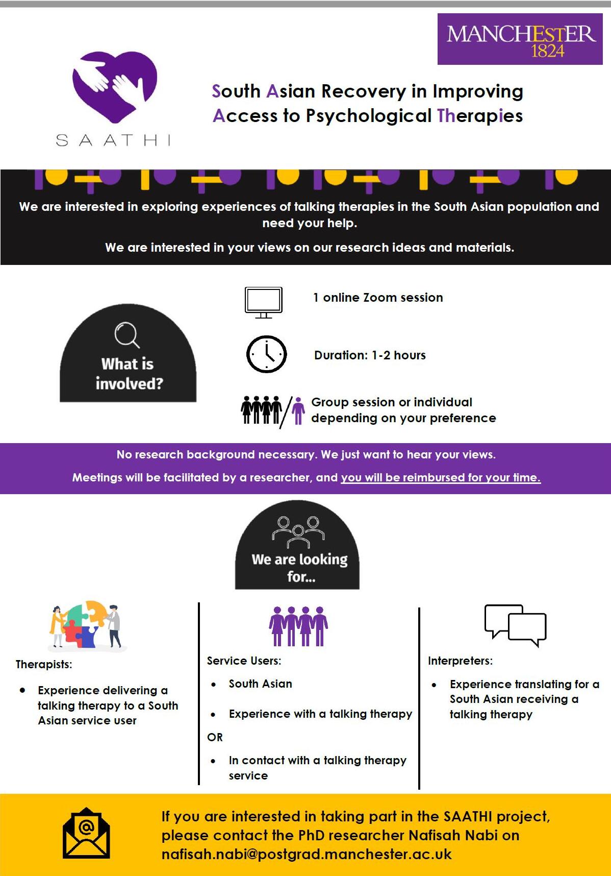 Nafisah Nabi a PhD student at the University of Mancheste is working on a PhD research project focuses on exploring the barriers and facilitators to recovery for South Asian service users within IAPT services. Nafisah is looking to recruit a Patient and Public Involvement Group who can offer feedback on research plans and study materials.