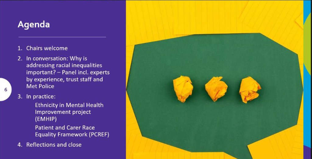 Ellie wanted to tell us about the mental health patient safety network event, which is part of their mental health safety improvement programme. Ellie apologised for the acronyms flying around on the programme, but thanked us for inviting her to join and speak at our ethnic carer group.