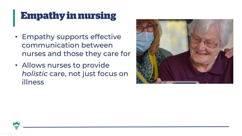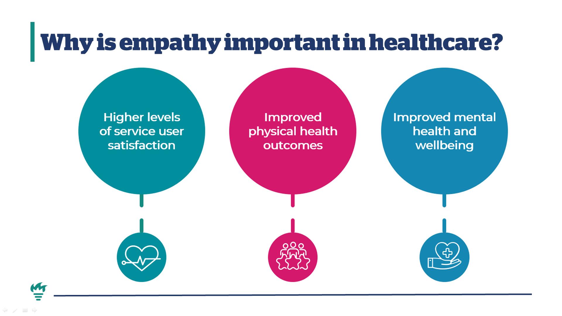 The reason why empathy is so important is that in an health care setting, it can provide some important benefits for people that nurses and other health care providers care for. There is good research that if somebody is empathetic as a health care provider, then the person they provide care for is likely to have a better experience might see higher levels of service user satisfaction.