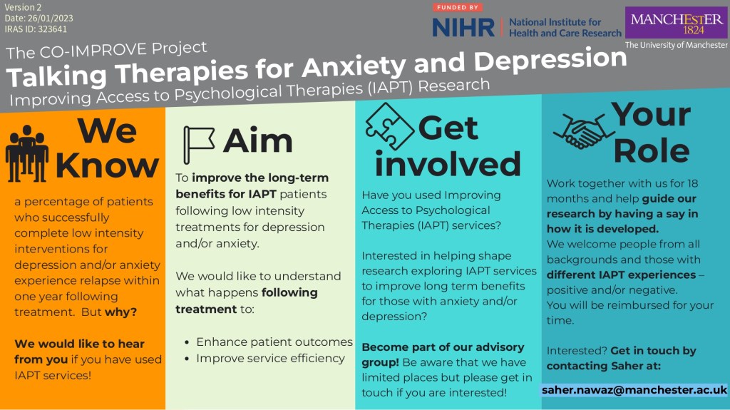 If so, you might be interested in helping shape research exploring IAPT services to improve long term benefits for those with anxiety and/or depression. A new Advisory group is forming, but there are limited places.