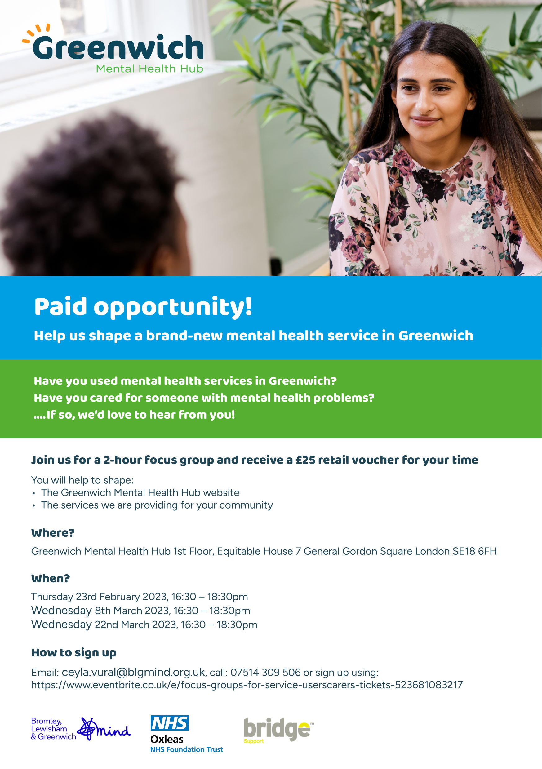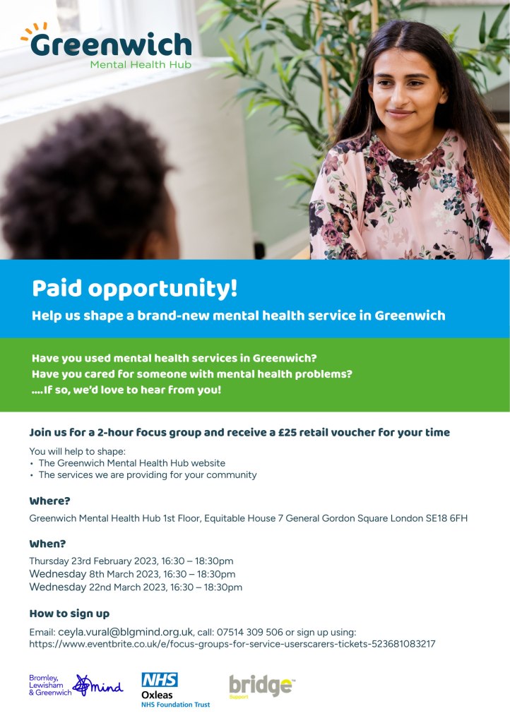 Greenwich Mental Health Hub is holding a PAID opportunity(£25 retail voucher) for their focus group events to help shape mental health!