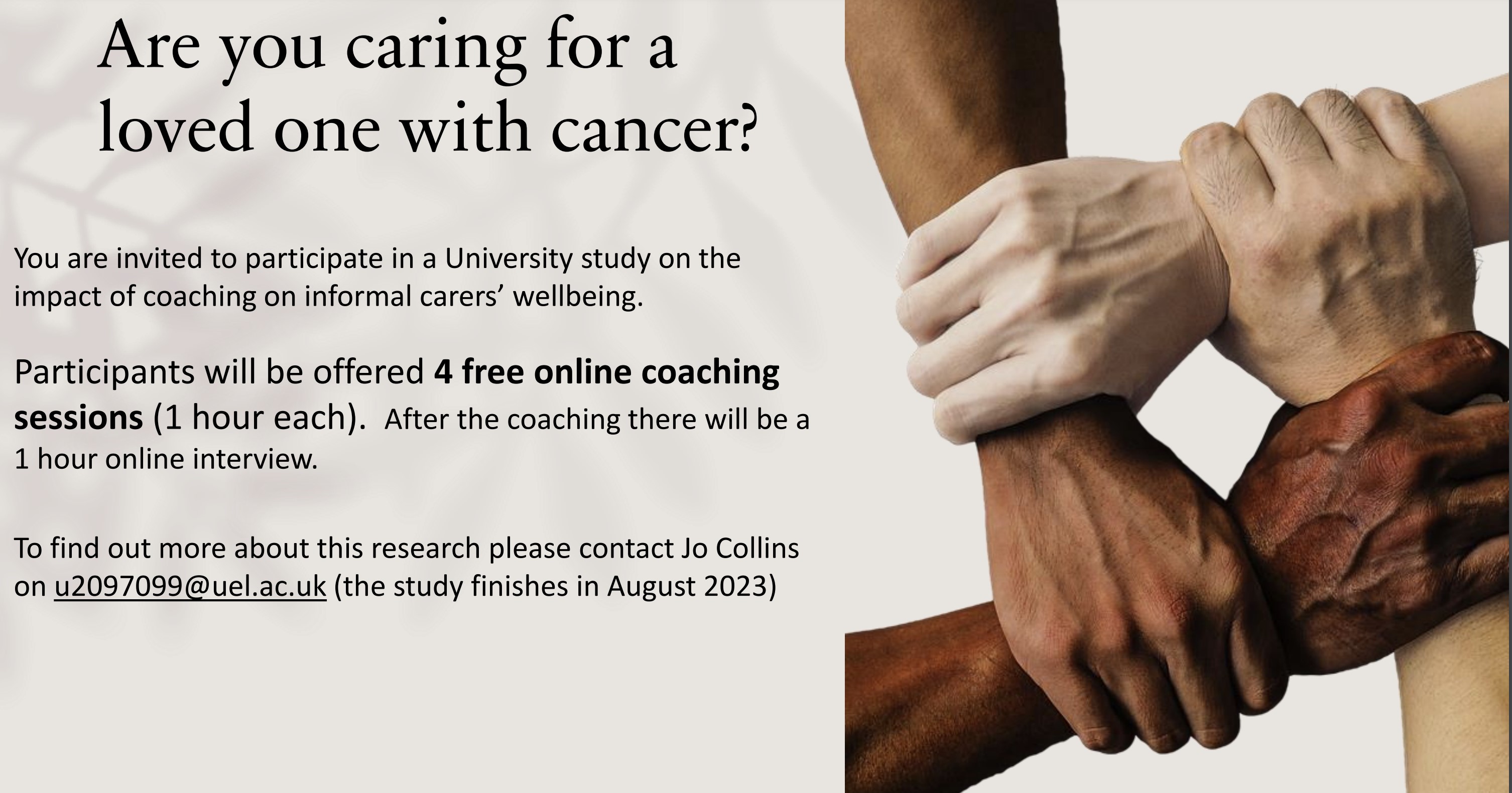 The study aims to support carers of cancer patients through coaching conversations, and is part of a Master’s dissertation investigating the wellbeing effects of coaching. The research has been ethically approved by University of east london’s Psychology Ethics Committee.