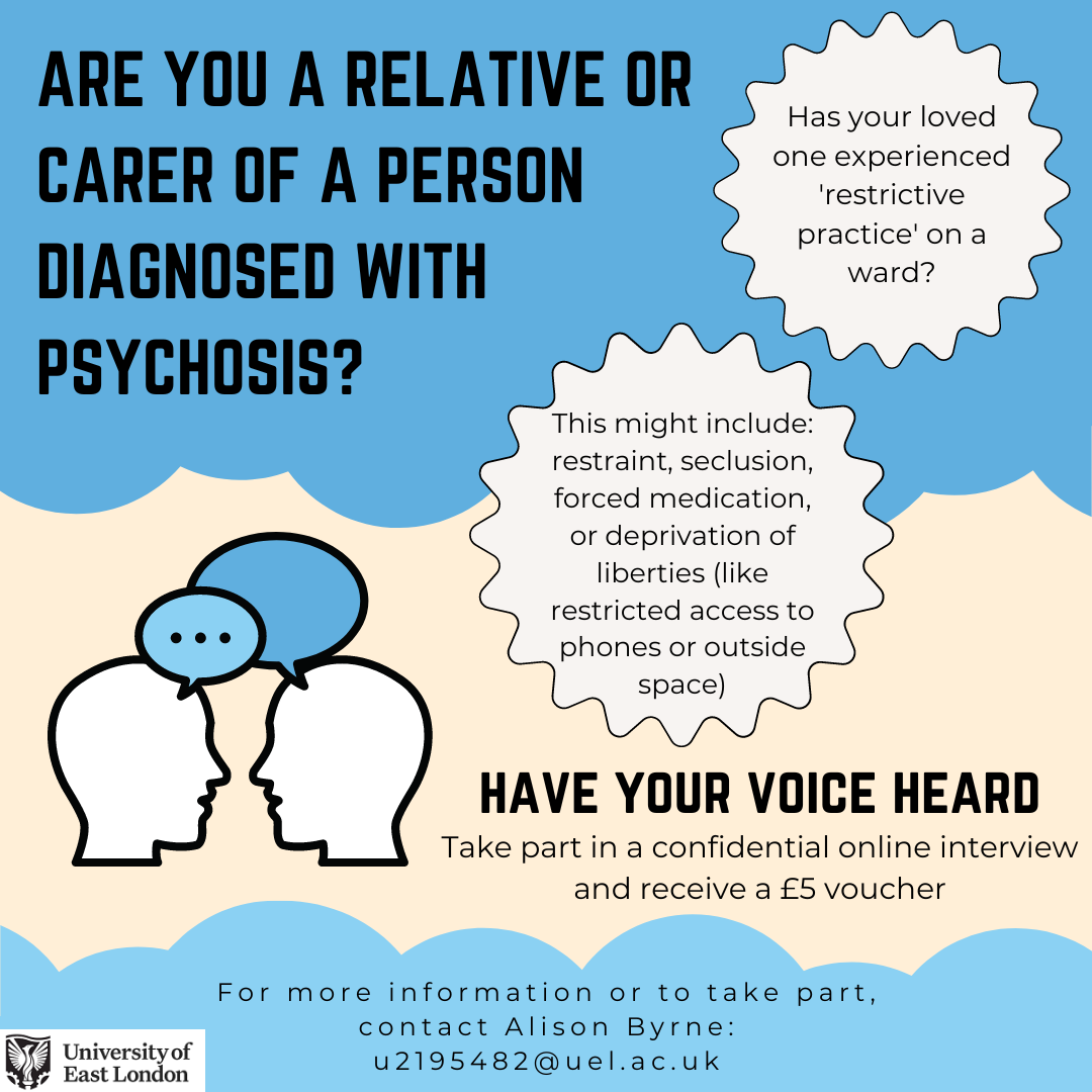 - A relative or other carer (including friends) of someone who experiences ‘psychosis’ (e.g. delusions, hallucinations, or other unusual experiences; a formal diagnosis is not necessary)