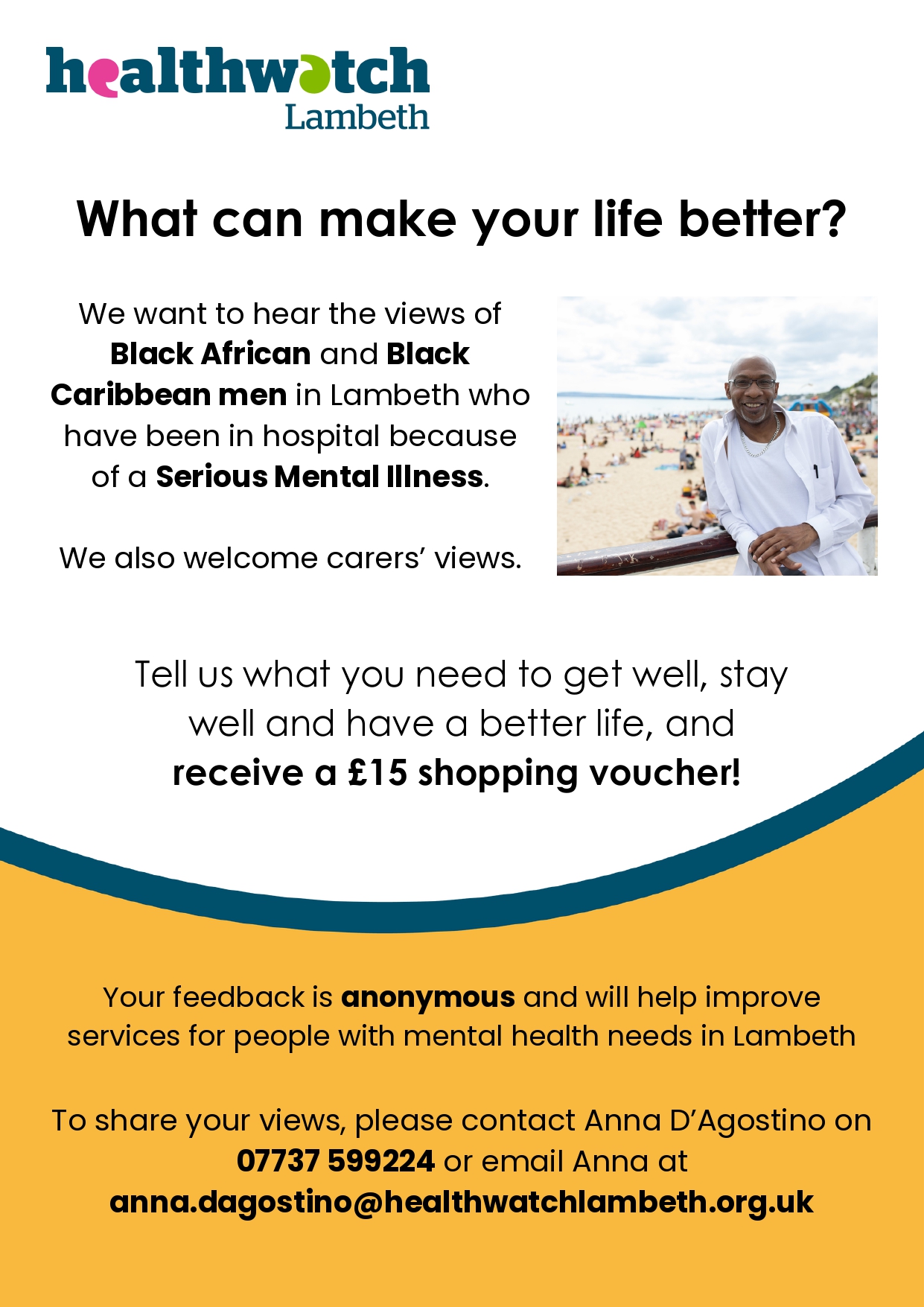 It has consistently been shown that black men have the poorest experiences and outcomes when it comes to mental health services. So Healthwatch Lambeth wants to hear your experiences of caring a male relative who has a Serious Mental Illness, been hospitalise as a result of their illness and then discharged to their GP.
