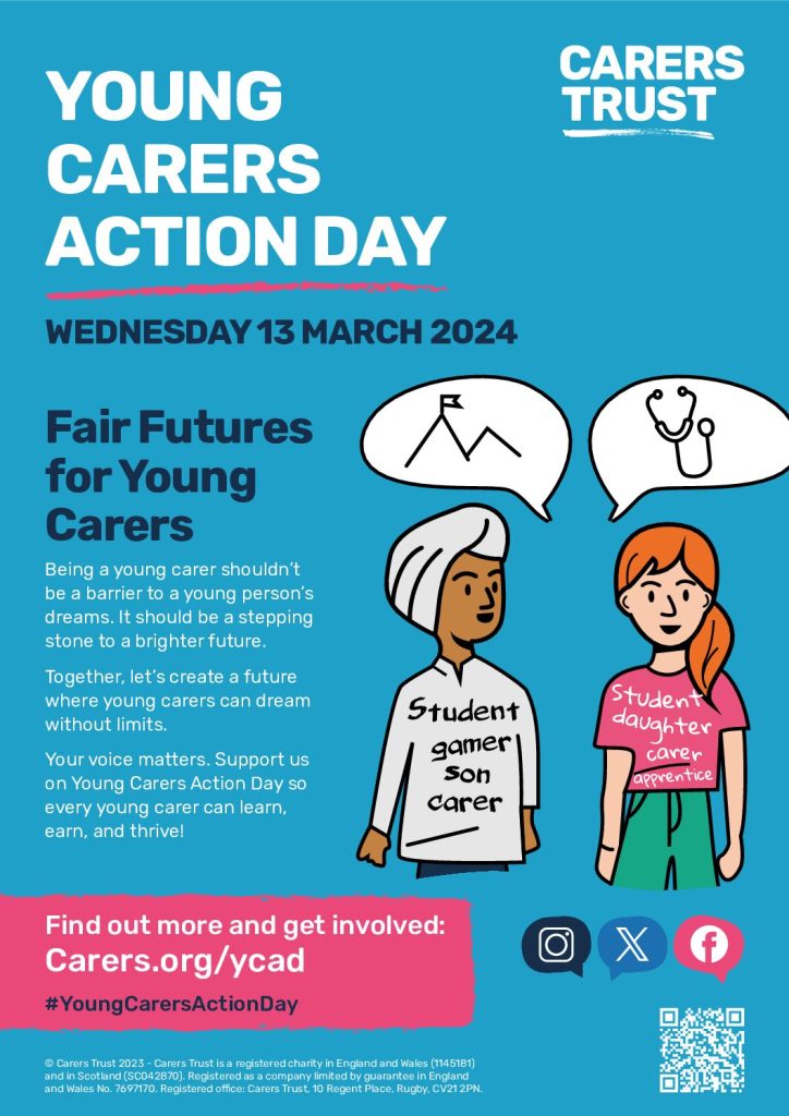 The theme for Young Carers Action Day 2024 is ‘Make Time for Young Carers‘. The theme looks at fair futures for young carers which will be focussing on why caring should not be a barrier to learning.