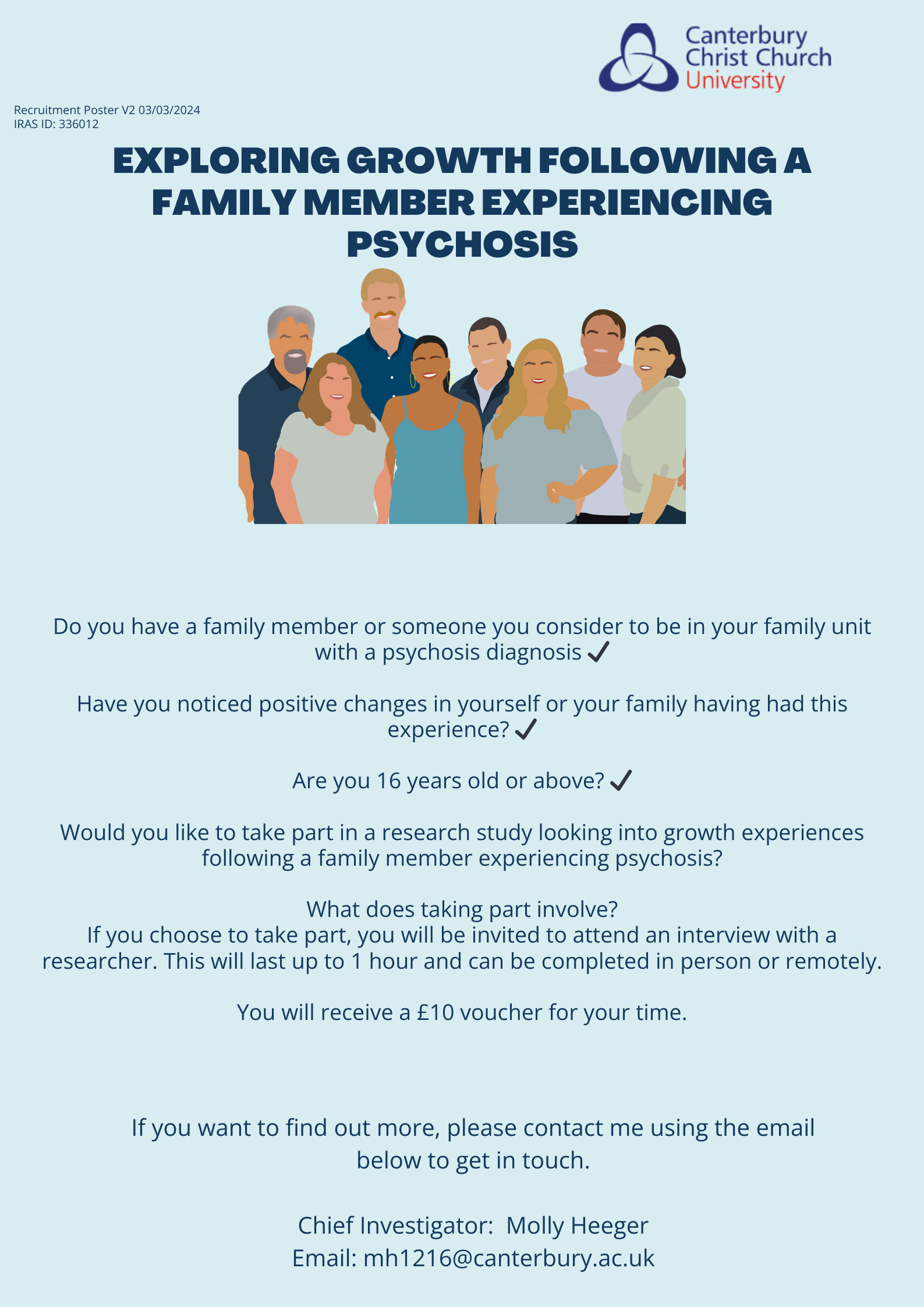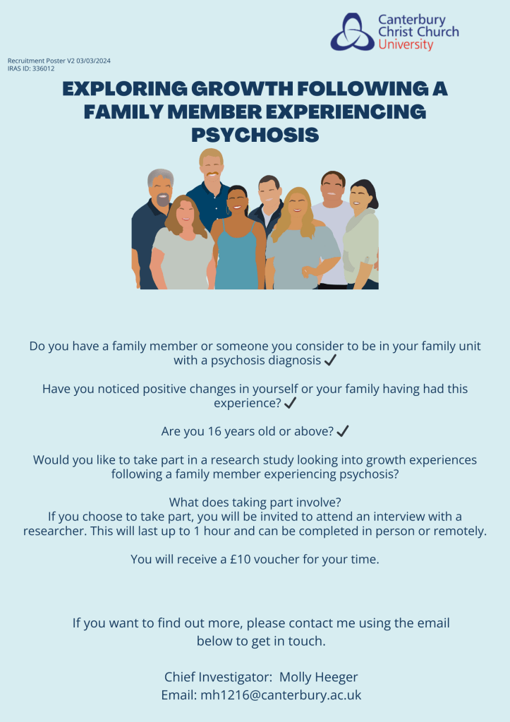 She is recruiting for her research project exploring family members experiences of supporting someone with psychosis. If you are caring for someone suffering from psychosis and would like to be involved in the study, please see poster below.