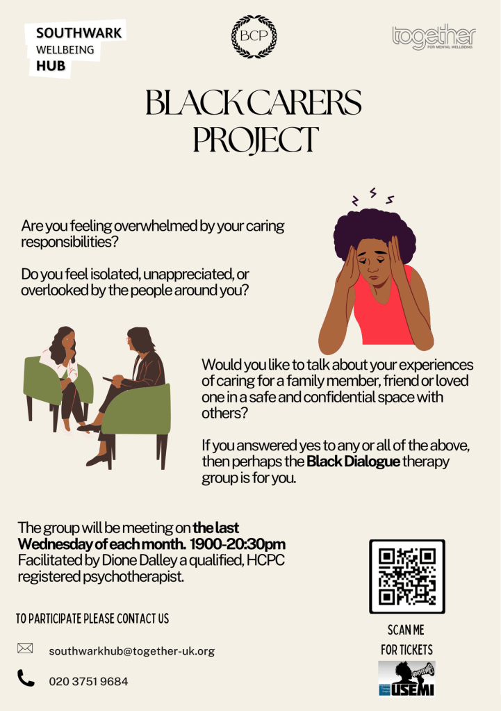 There is a new project from the Southwark Wellbeing Hub that uses group therapy. Its aim is for Black Carers to share a supportive space to discuss and manage the challenges they face.