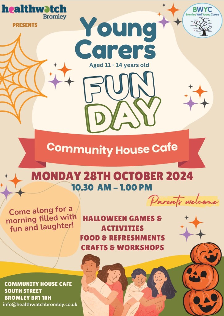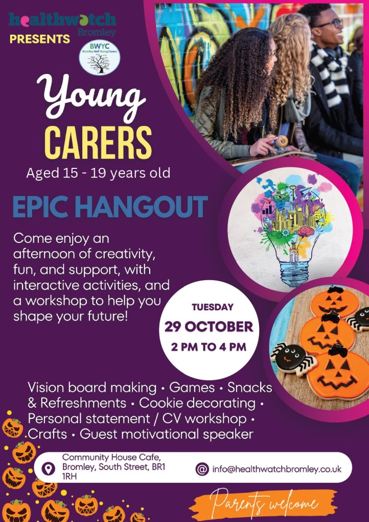 Here are two events for young carers over in the London Borough of Bromley. Check out the posters below for details. For more details contact Healthwatch Bromley – info@healthwatchbromley,co,uk