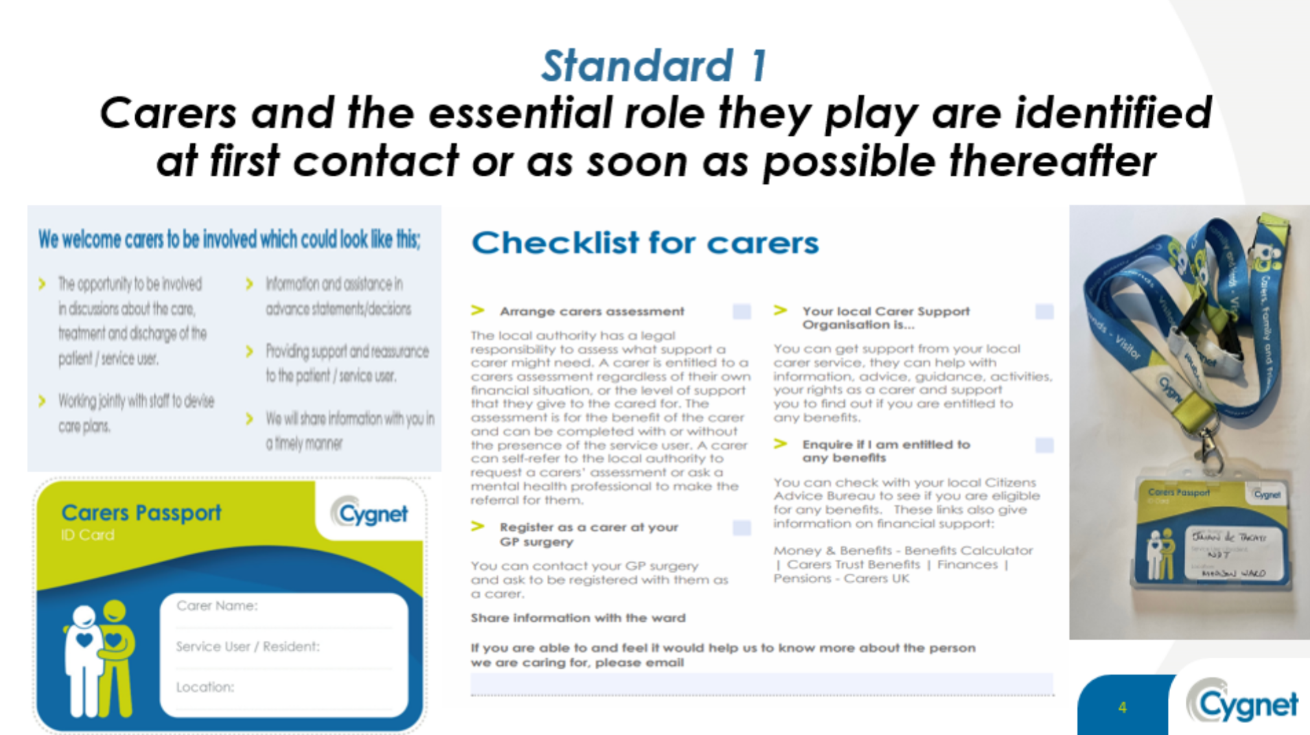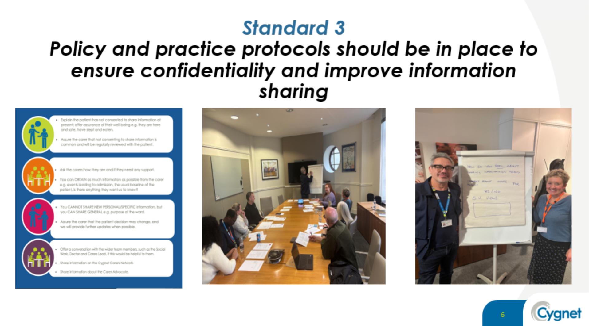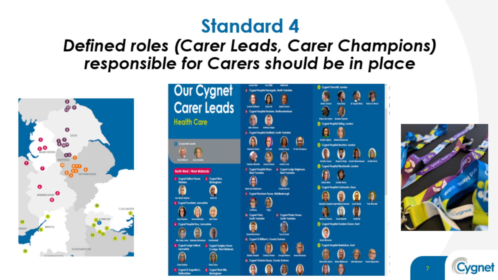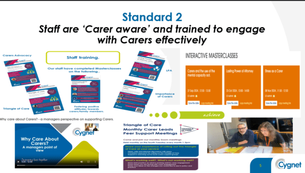 Julian walked through each of the six standards of the Triangle of Care, showing how Cygnet is working to co-produce them with carers: