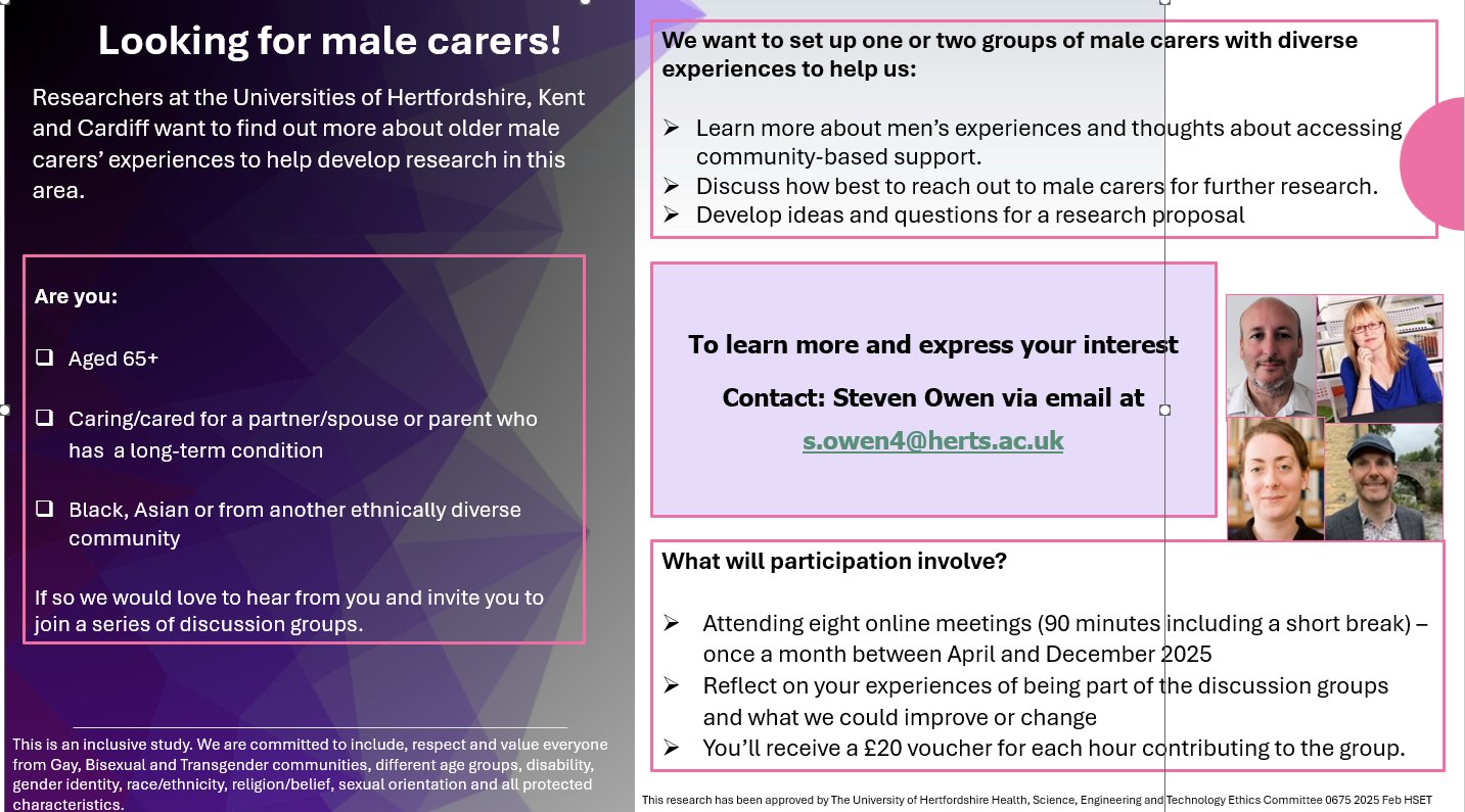 This inclusive study especially welcomes participants from Black, Asian, and other ethnically diverse communities. By taking part, you’ll have the chance to share your thoughts in a safe, supportive environment and help ensure older male carers’ voices are heard.