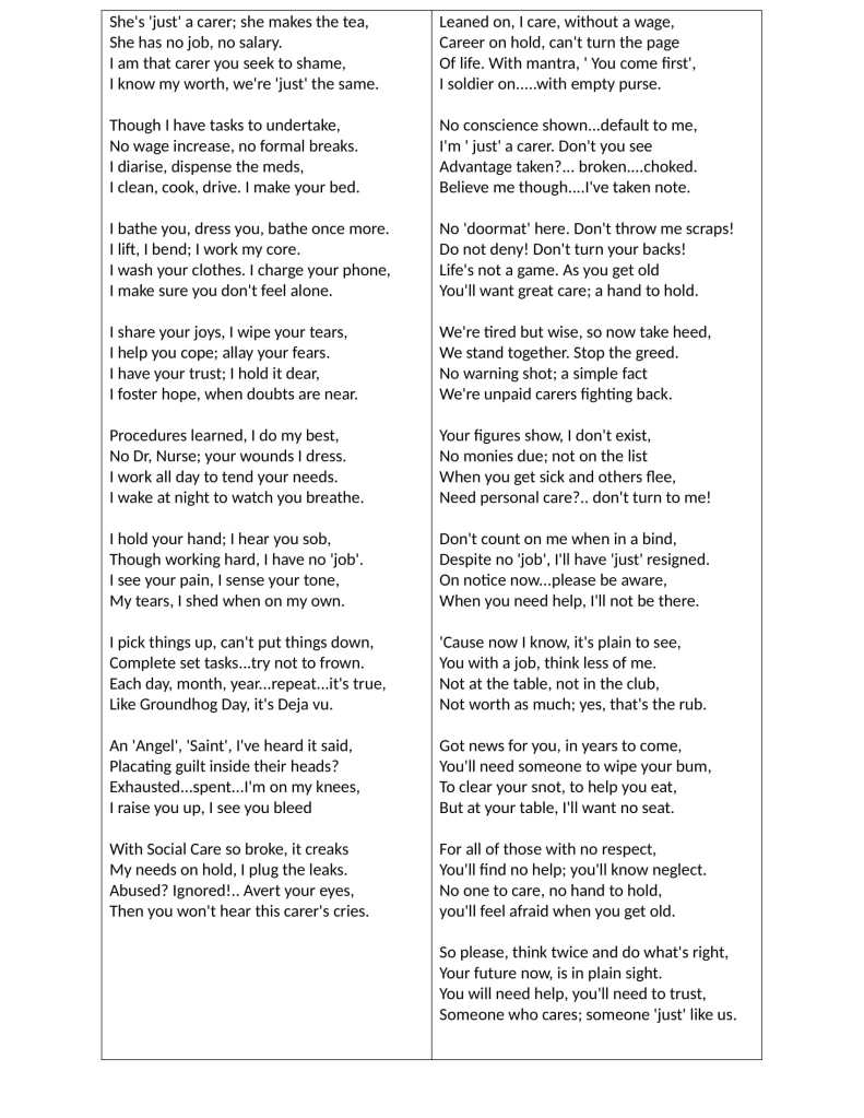 One of the most striking poems, “She’s Just a Carer,” lays bare the reality of unpaid care: