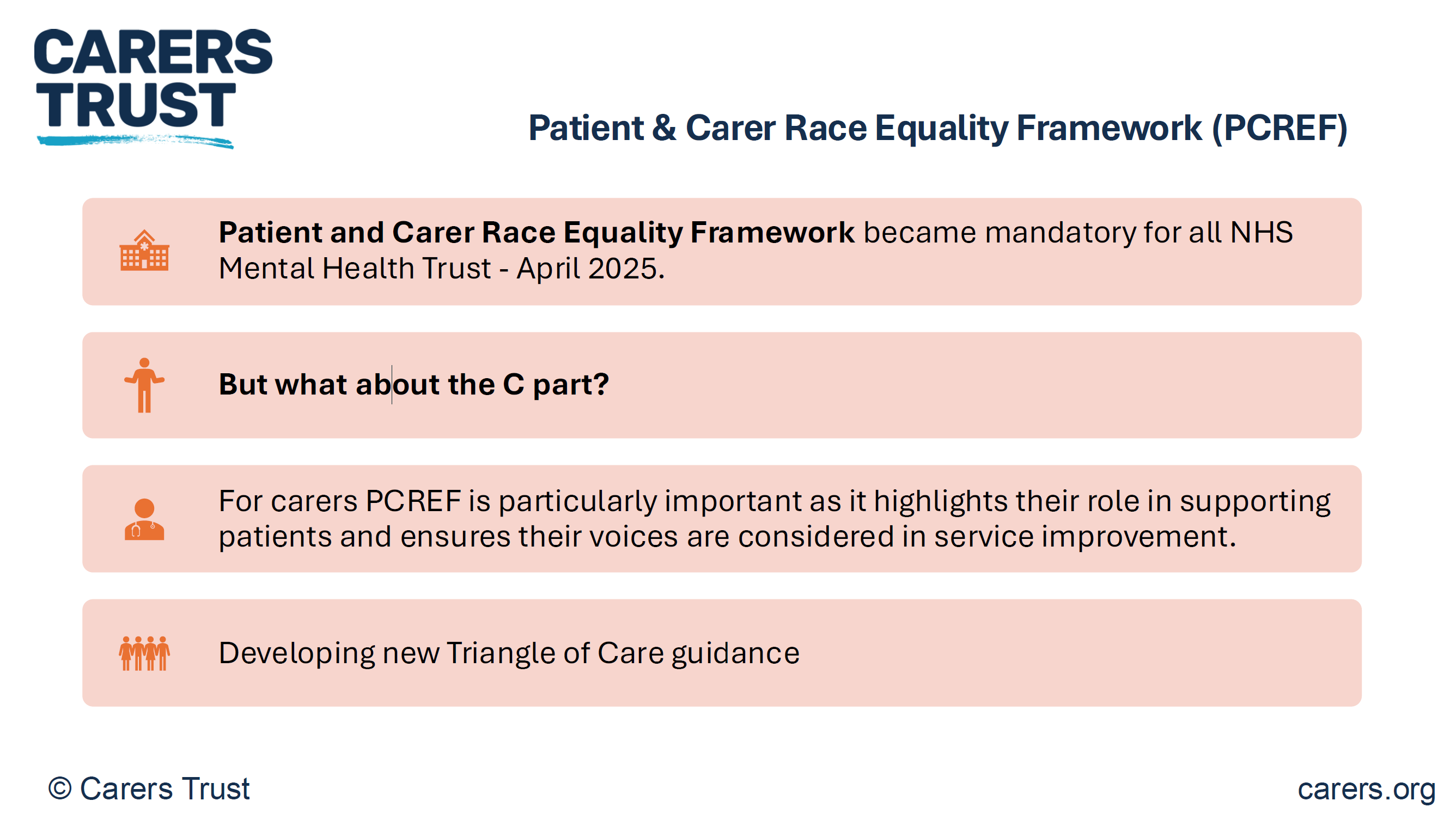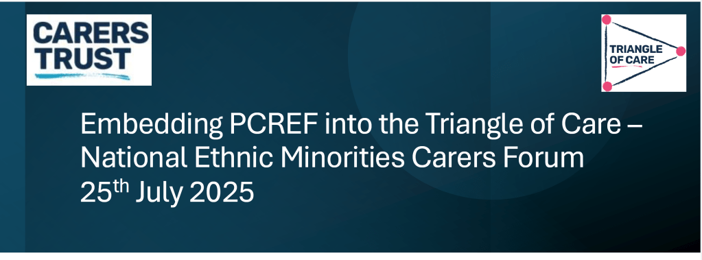 On Friday, July 25th, the National Ethnic Mental Health Carer Forum held another online session, continuing our work in empowering diverse carers and influencing meaningful change across mental health services. With participation from community champions, NHS professionals, experienced unpaid minority carers. The discussion was on the Triangle of Care (ToC) and PCREF (Patient Carer Race Equality Framework) stakeholders.