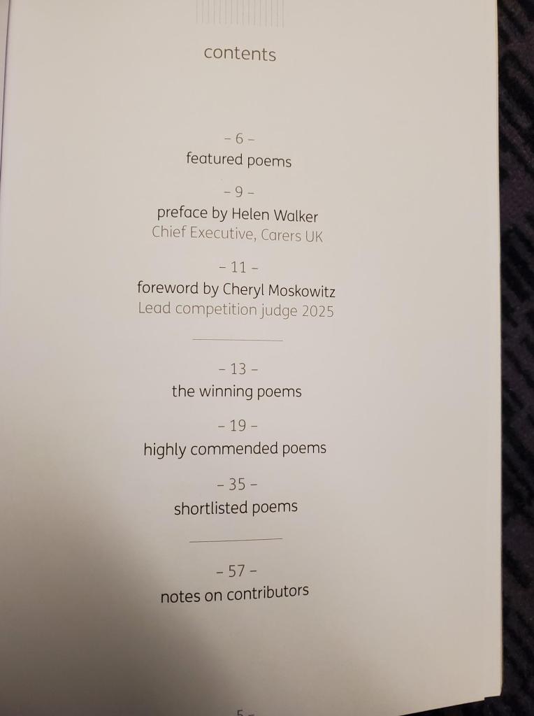 The programme included readings of winning, highly commended, and shortlisted poems. The anthology also features a preface by Helen Walker, Chief Executive of Carers UK, and a foreword by Cheryl Moskowitz, Lead Competition Judge 2025.