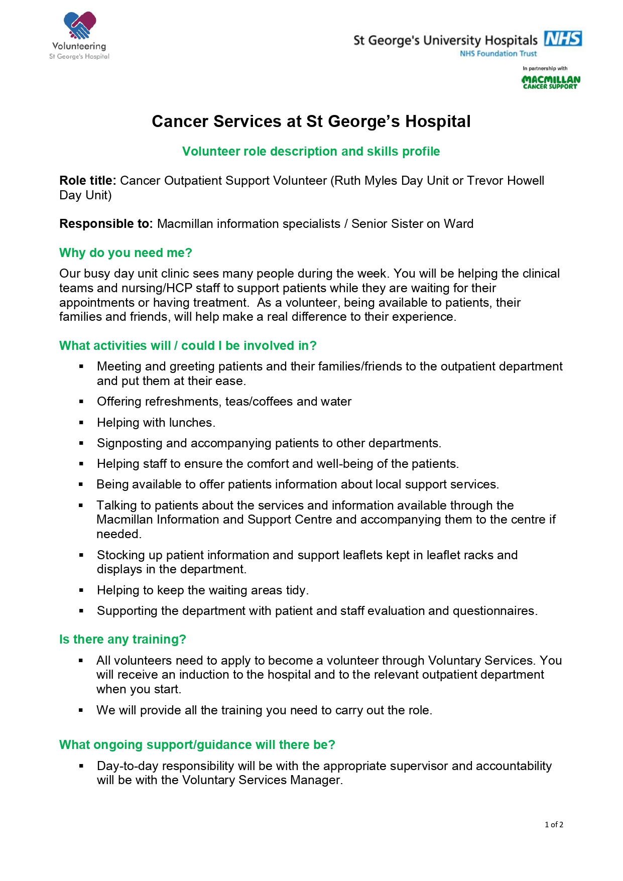St George’s Hospital is looking for compassionate and friendly volunteers to support patients in the Ruth Myles Day Unit and Trevor Howell Day Unit.