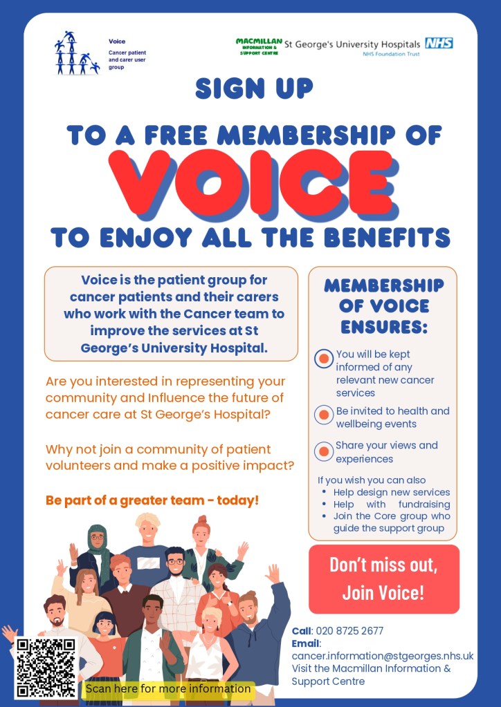 Voice is a dedicated patient and carer group that works closely with the Cancer Team at St George’s. It provides a vital forum for sharing experiences, ideas, and suggestions that directly influence how services are planned, developed, and improved.