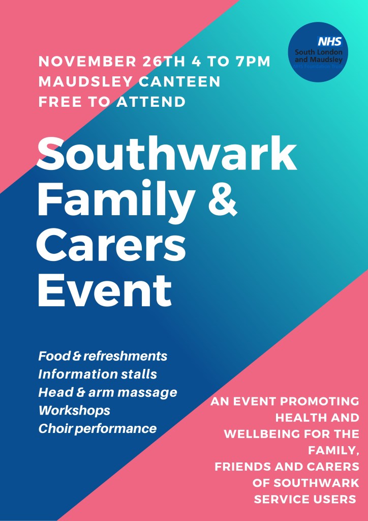 South London & Maudsley NHS Foundation Trust (SLaM) will be hosting a special event for the family and carers of anyone using the services of Southwark community mental health teams, inpatient, or crisis services.