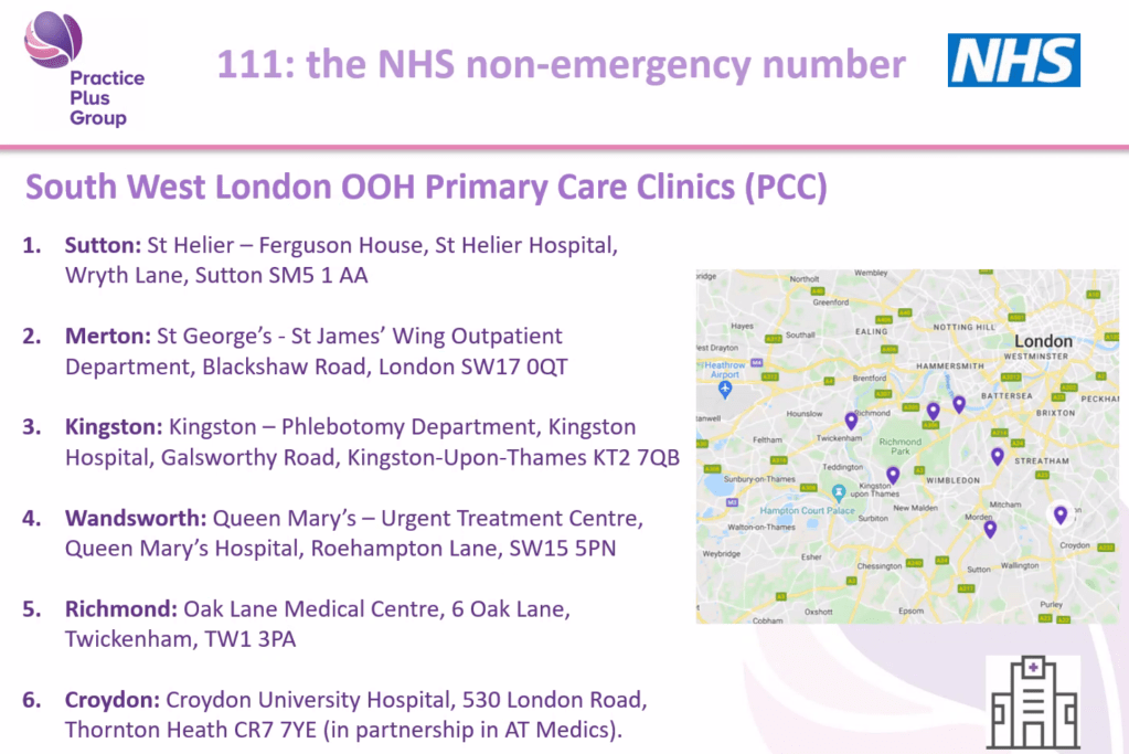 Dal also explained the role of Primary Care Clinics (PCCs) located across South West London. These clinics operate outside normal GP hours and can see patients the same day—but crucially, access is by 111 referral only. If 111 decides that someone needs to see a GP face-to-face and can travel, they may be booked into a PCC appointment. Carers learned that you cannot walk into these clinics directly; 111 must assess the situation and confirm the appointment. This helps manage demand and ensures that appointments go to those who need them most urgently.