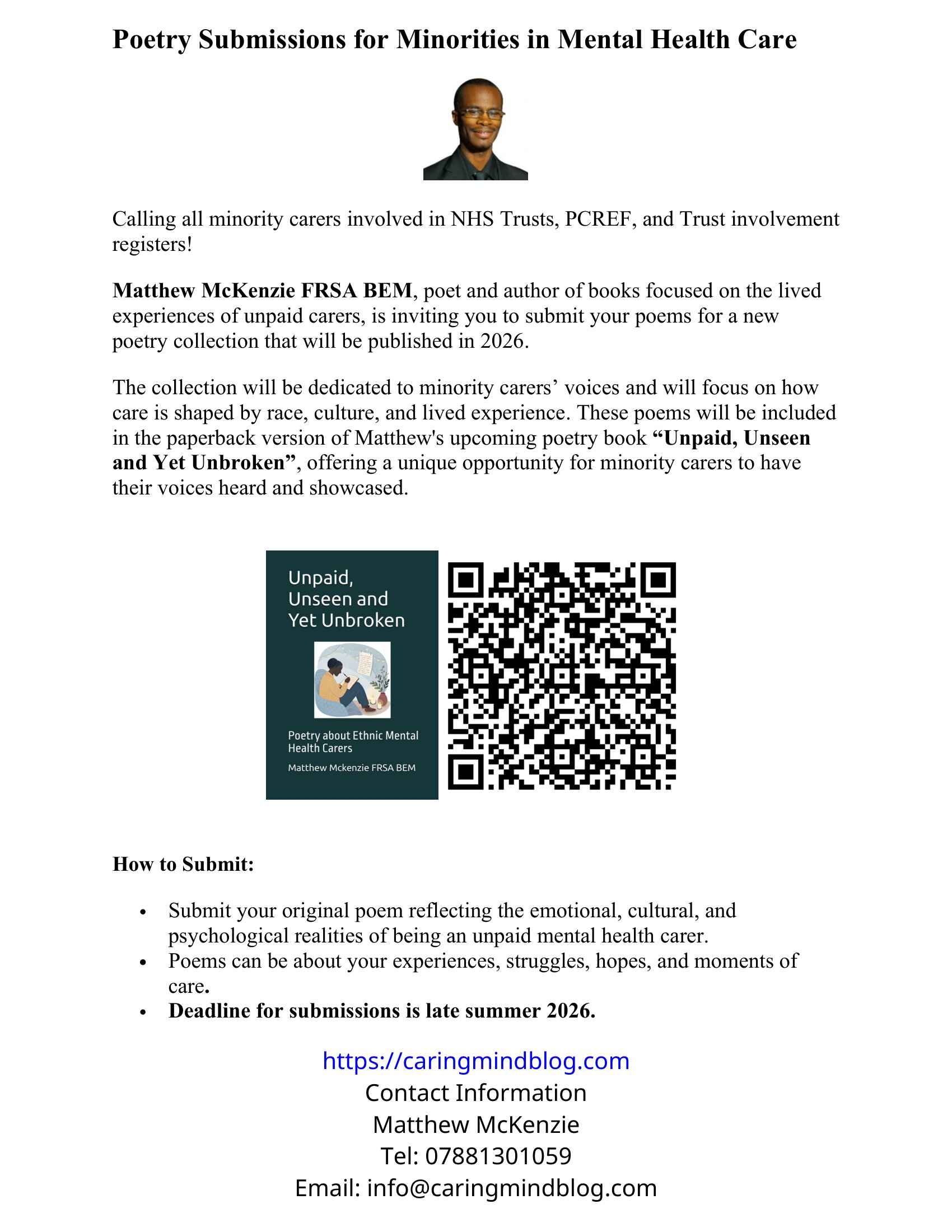 Matthew McKenzie FRSA BEM, poet and advocate for unpaid ethnic mental health carers, is inviting carers involved in NHS Trusts, PCREF (Patient and Carer Race Equality Framework), and Trust involvement registers to submit their poems for an upcoming 2026 poetry collection. This collection will spotlight minority carers’ voices and explore themes of race, culture, and lived experience in mental health care.