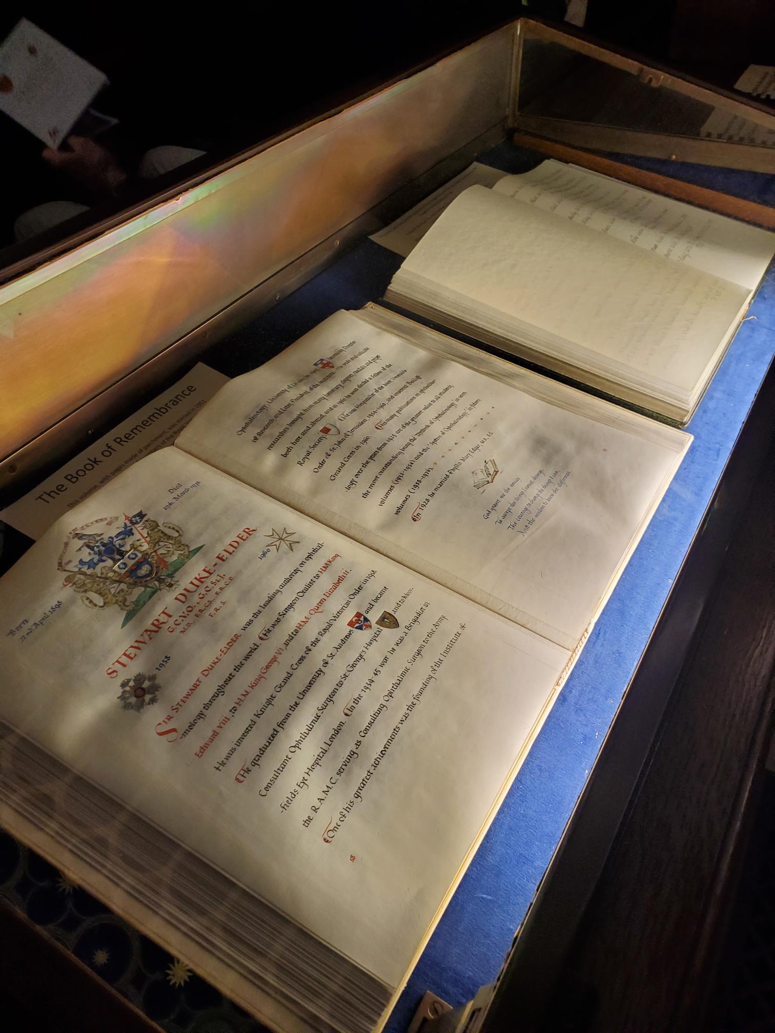 Displayed under protective glass, the Book of Remembrance is one of the most moving artefacts in the Savoy Chapel. It is handwritten and illuminated in a traditional style, much like medieval manuscripts.