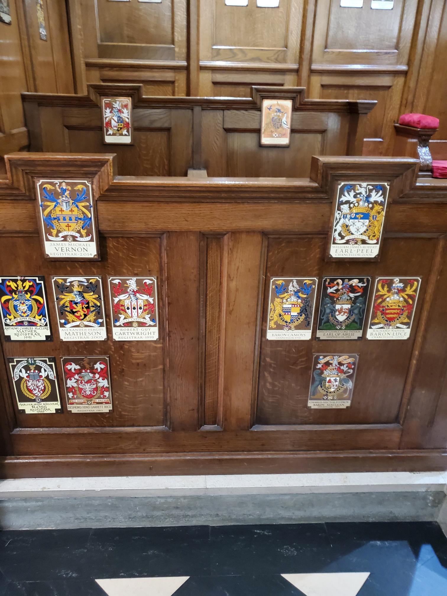 Along the wooden panelled walls were beautifully detailed heraldic plaques, each representing past members or senior figures associated with the Royal Victorian Order or individuals linked to the chapel’s long history of royal service.