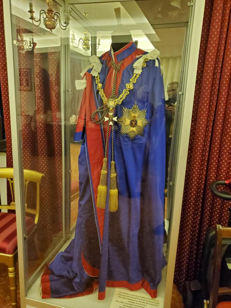 One of the most striking displays was the ceremonial mantle worn by a Knight Grand Cross of the Royal Victorian Order (GCVO). The deep blue and crimson robe, gold tassels, and the star emblem reflect the highest grade of this honour.