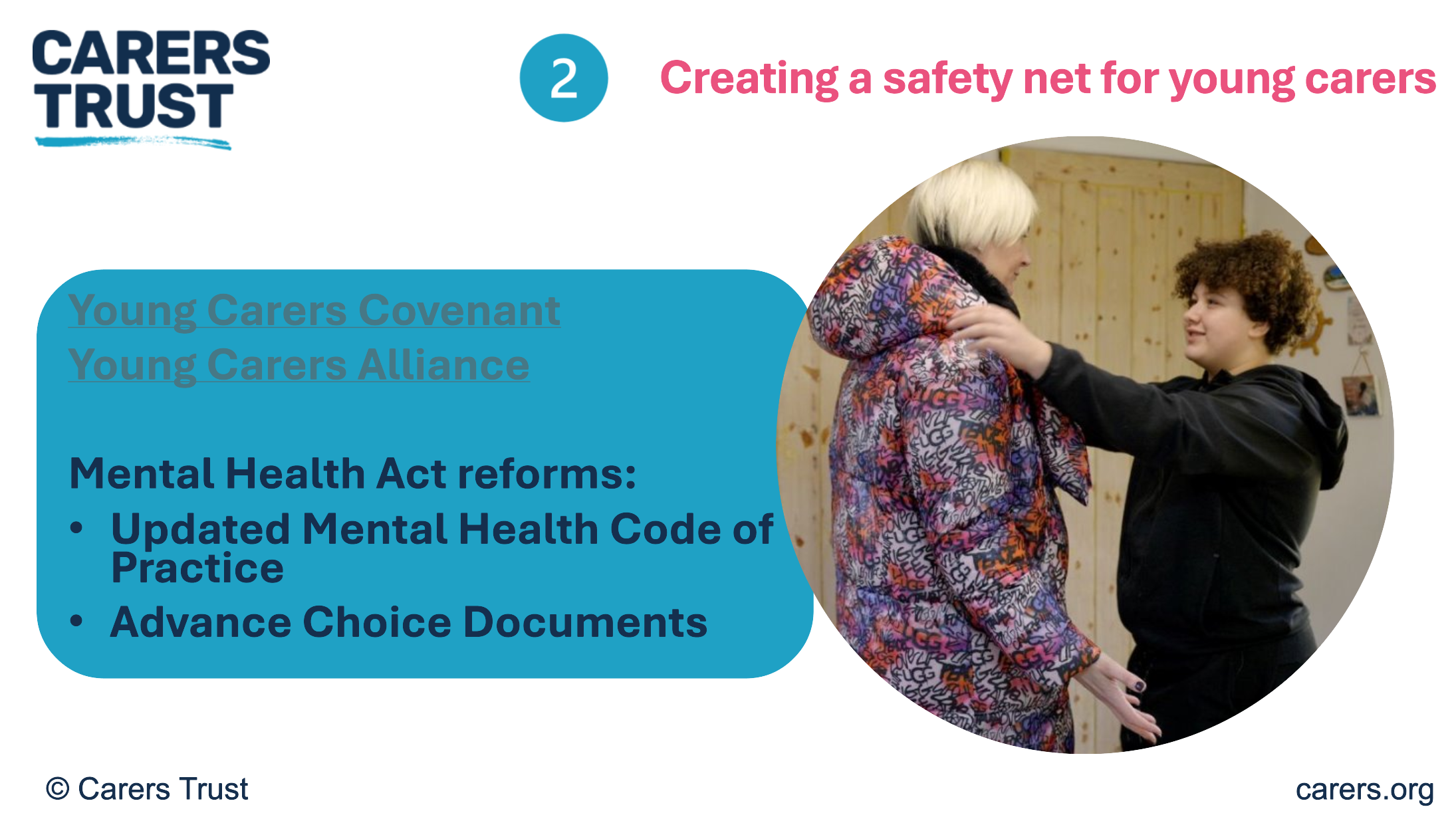 A major update was the successful national policy win relating to young carers and the Mental Health Act.
