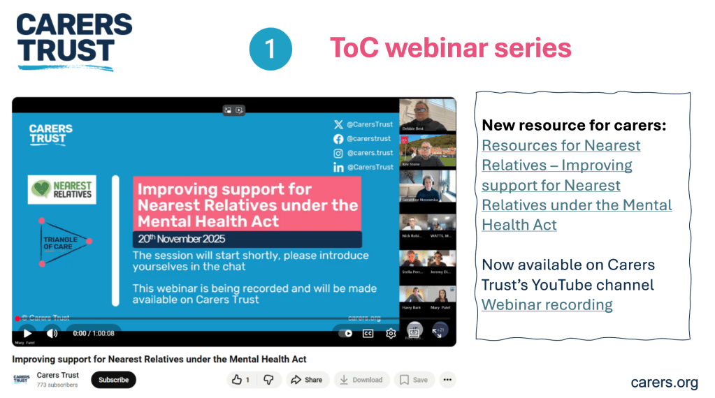 ToC’s Lunch & Learn series continues, with the recent Carers Rights Day webinar (in partnership with University of Bristol) focusing on the Nearest Relative role under the Mental Health Act (MHA). Resources are available via Carers Trust’s YouTube channel.
