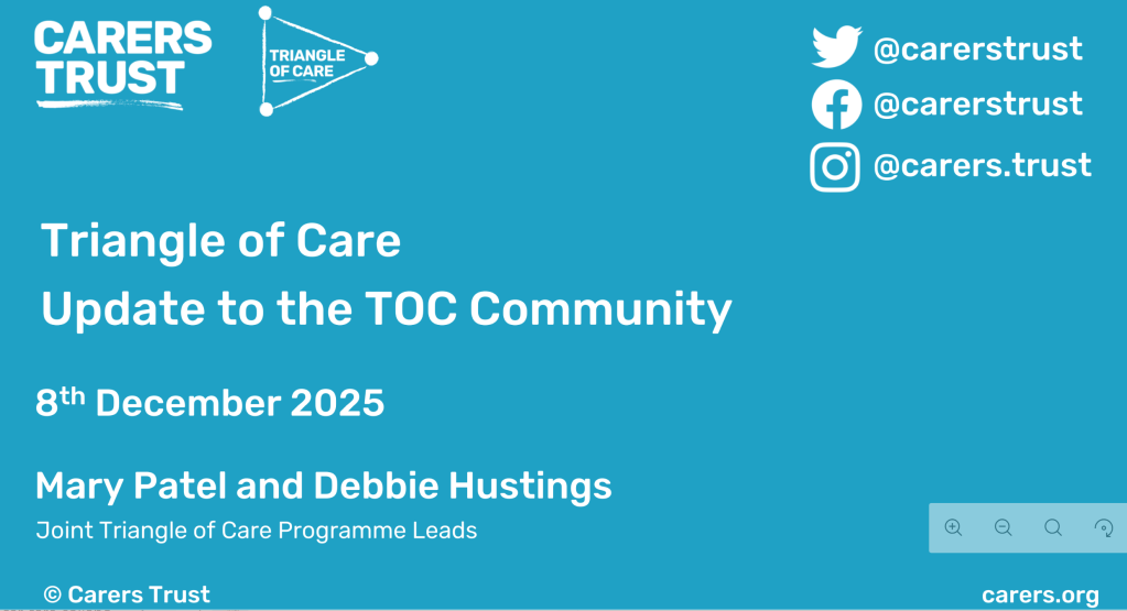 Our final Triangle of Care (ToC) Community Group meeting of the year brought together carers, professionals, and ToC members from across the UK to share updates, raise concerns, and discuss priorities for 2026 and beyond. Although Microsoft Teams provided some surprises, we made it work, thanks to teamwork and patience. The conversation was rich, heartfelt, and often very moving.