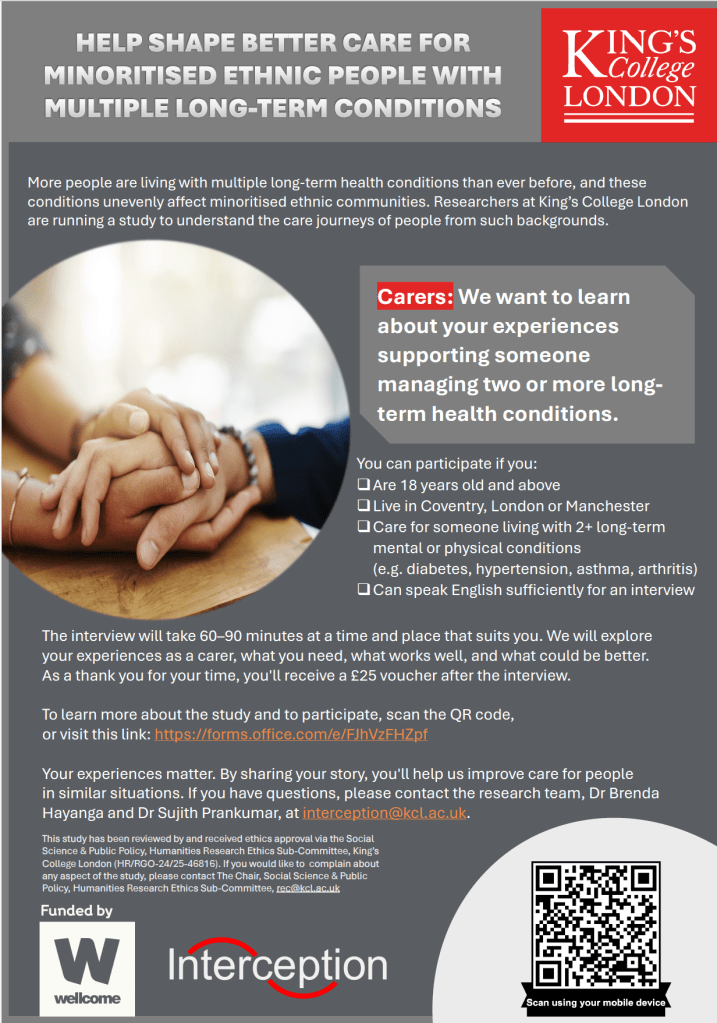 To learn more or sign up, scan the QR code on the flyer or visit this link . If you have any questions, you can contact the research team, Dr Brenda Hayanga and Dr Sujith Prankumar, at interception@kcl.ac.uk.