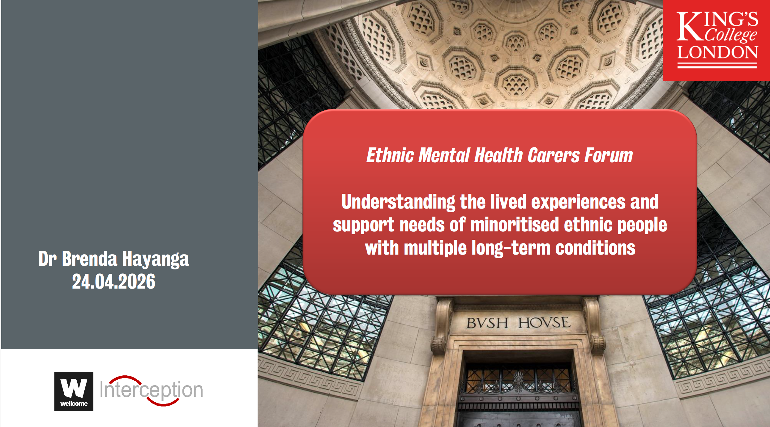 - Speaker 1: Brenda Hayaka (King’s College London): Findings on ethnic inequalities in healthcare and the new “Interception” study.