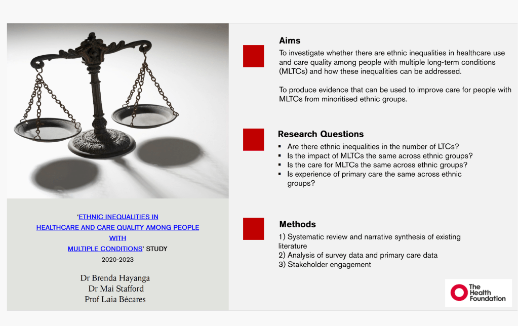 Brenda shared findings from her previous work on ethnic inequalities and introduced her new study on Multiple Long-Term Conditions (MLTCs).