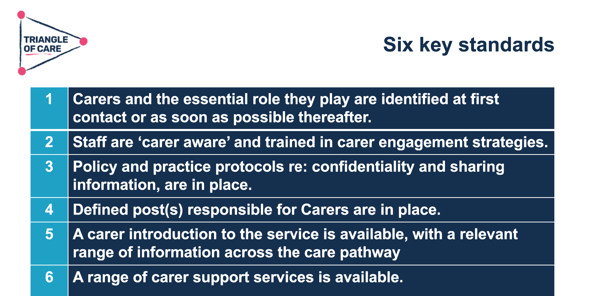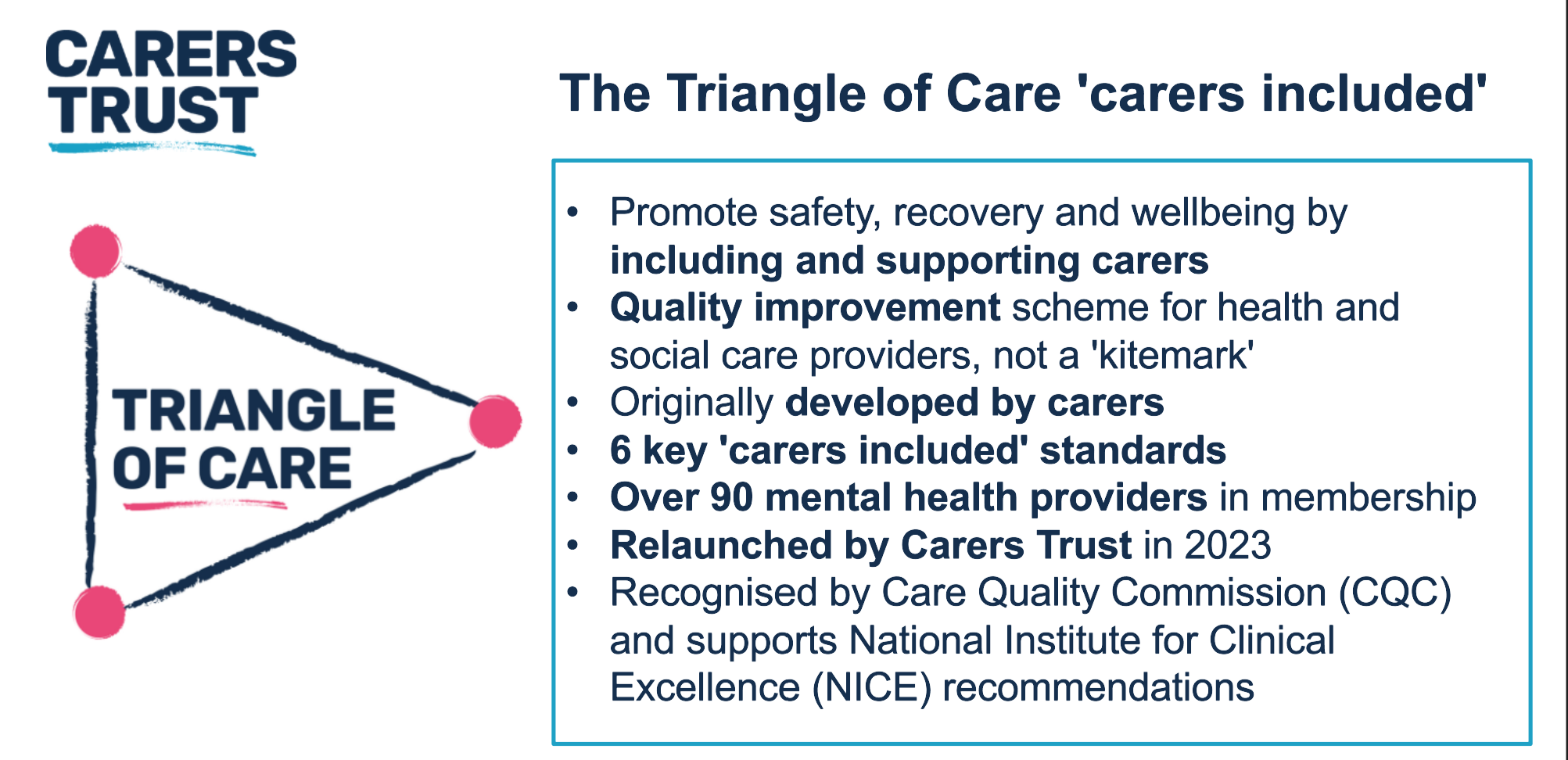 Embedding standards: Triangle of Care standards remain the six core standards developed with carers in 2010, underpinning governance, carer involvement, action planning, culture change, feedback mechanisms, and co-production. Mary emphasised that self-assessment is a reflective improvement tool, not a quality mark. Culture change initiatives: Focus on carer awareness training, senior leadership engagement, and the “golden thread” of carer involvement throughout services. Support for members: