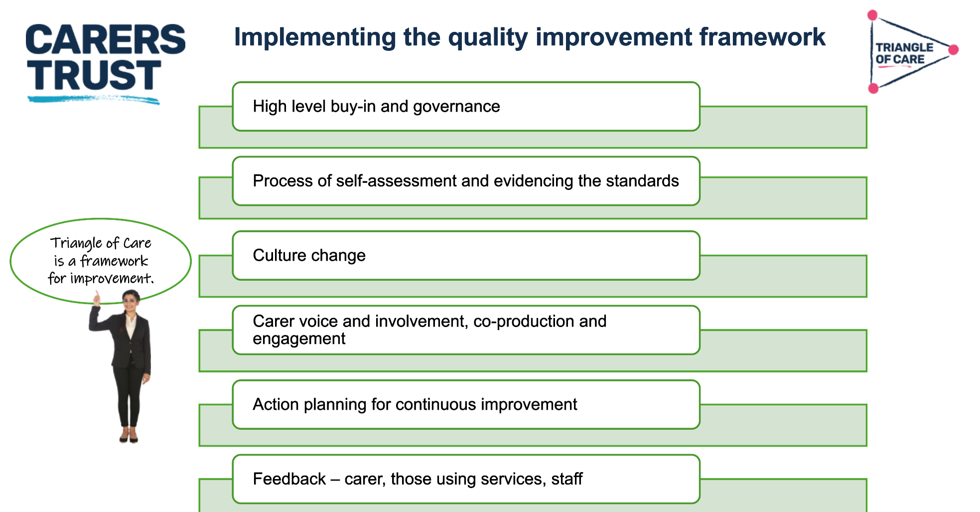 - How will carers be consistently involved throughout the framework’s delivery?